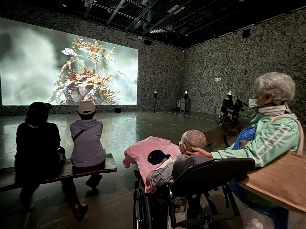 在展場中,家屬與照護員推著輪椅,讓植物人們穿在一幅幅生動奇幻的藝術作品前,體驗視覺與聲音的感官饗宴。對多數家庭而言,這樣的出遊曾是奢望。
