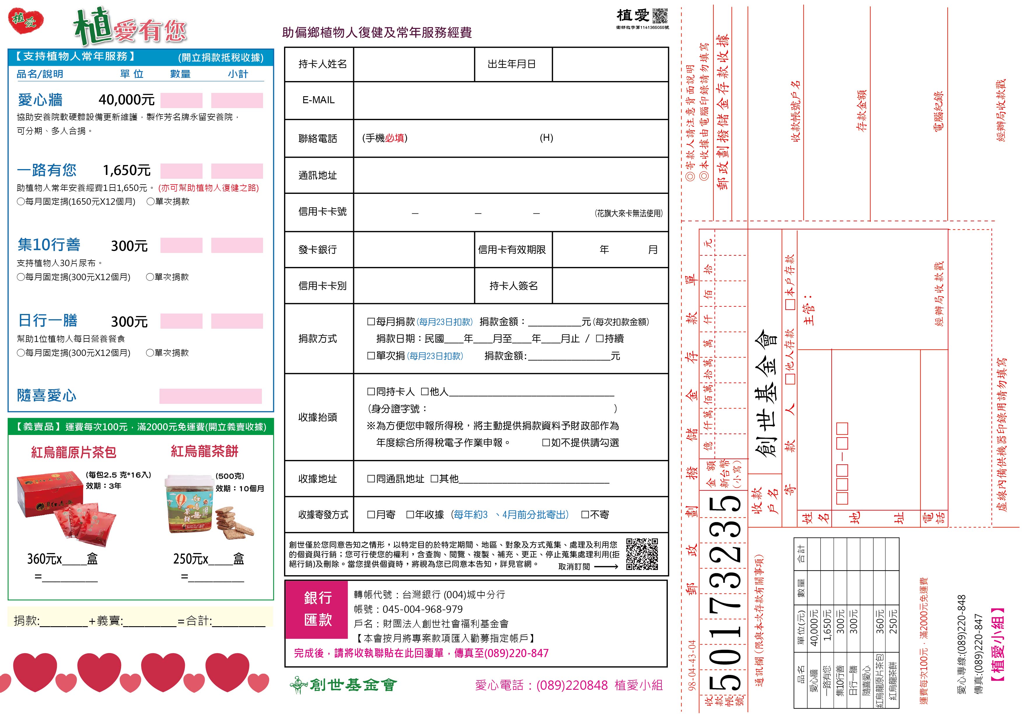 ※轉帳完成後,請來電告知帳號末五碼、收據抬頭、地址,或將存根聯、收據抬頭、電話、地址傳真至(089)220847,註明【植愛小組】,以利開立收據。
