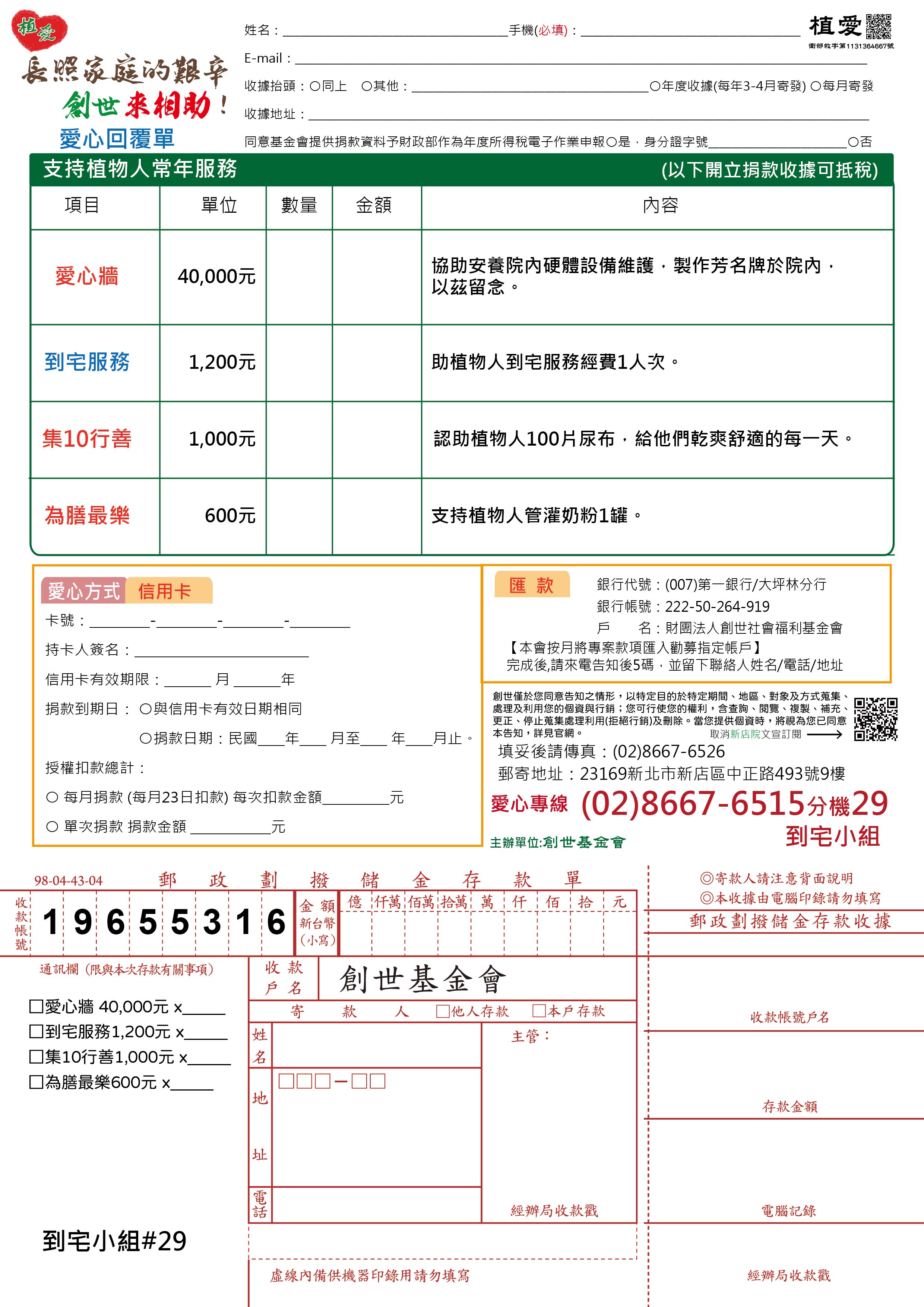 抬頭請開『財團法人創世社會福利基金會』,連同愛心回覆單掛號寄回到宅小組收。
