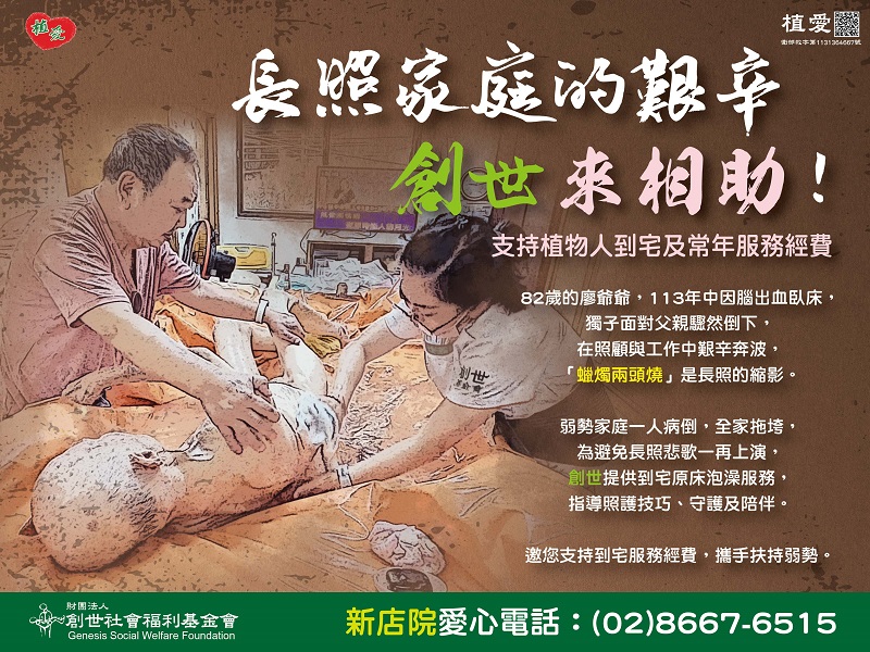 弱勢家庭一人病倒,全家拖垮,為避免長照悲歌一再上演,創世提供到宅原床泡澡服務,緩解長期臥床者搔癢難耐的肌膚,並提供照護技巧指導與資源連結,讓弱勢植物人家庭獲得更妥善的照顧,也多一份守護及陪伴。