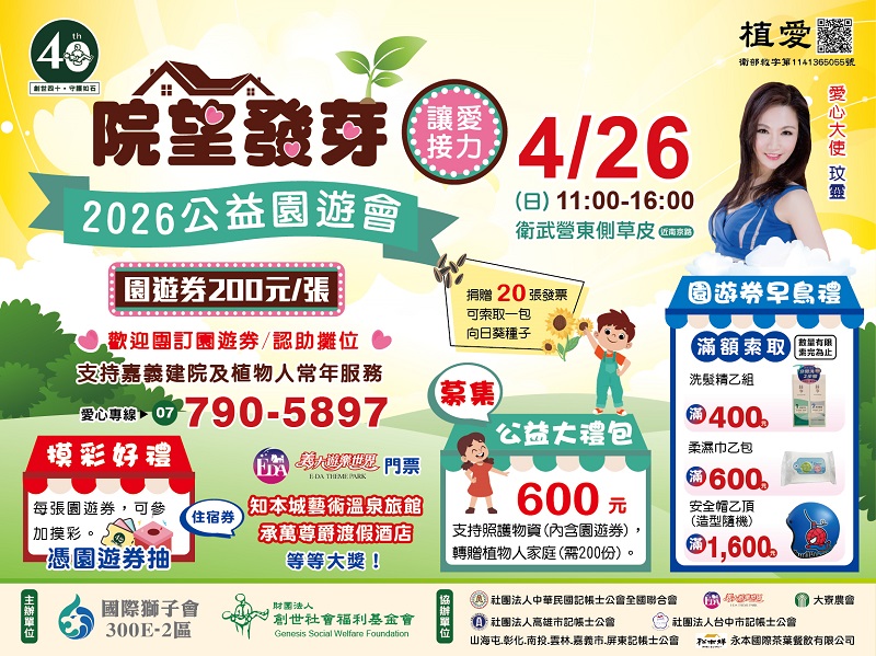 鳳山院結合高雄善心單位舉辦「院望發芽.讓愛接力」公益園遊會,邀請社會大眾帶著家人朋友一起來園遊會做公益、獻愛心,用行動支持植物人服務,也幫助創世持續守護更多弱勢家庭,讓愛發芽,讓愛接力。