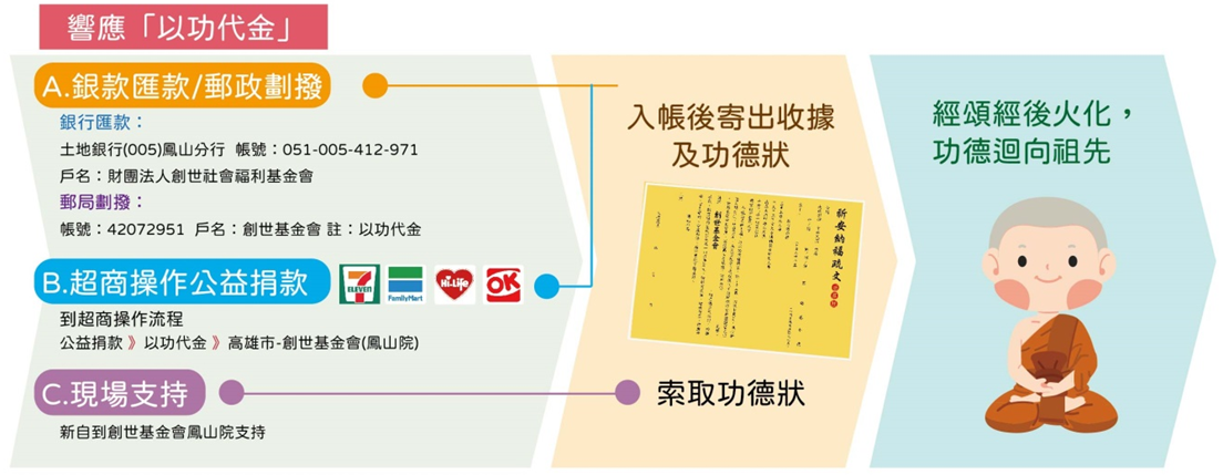(愛心捐款–以功代金-高雄市-創世基金會(鳳山院),就可以將購買紙錢的費用轉捐給創世,幫助植物人服務。