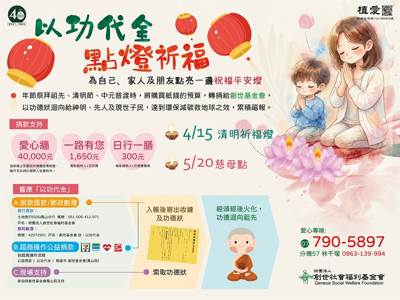 年節祭拜祖先、清明節、中元普渡時,將購買紙錢的預算,轉捐給創世基金會,以功德狀迴向給神明、先人及現世子民,達到環保減碳救地球之效,累積福報。