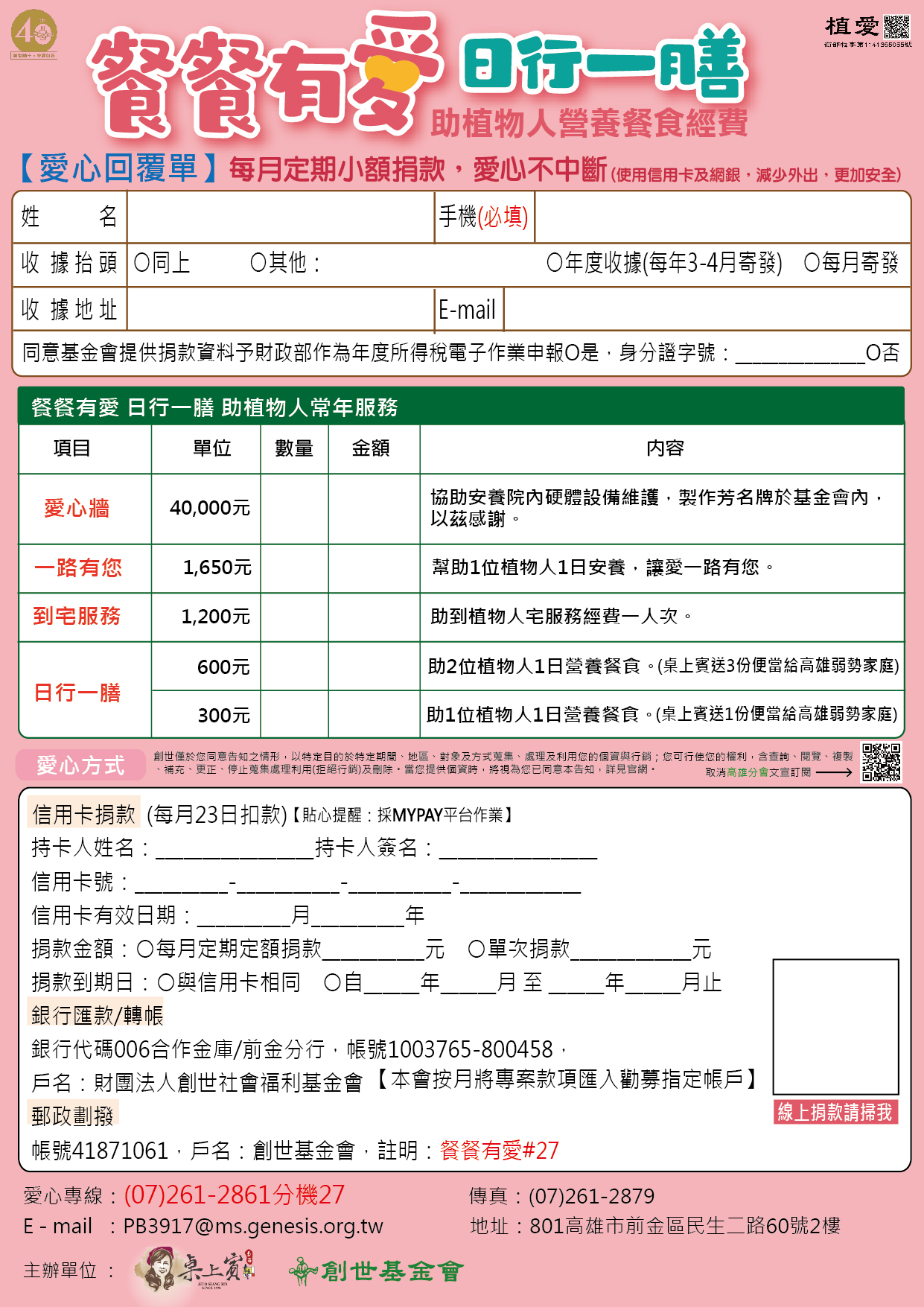 抬頭請開『財團法人創世社會福利基金會』,掛號寄至:高雄市前金區民生二路60號2樓,餐餐有愛小組收。