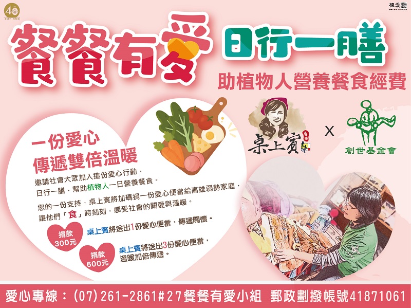 [高雄]:【桌上賓x創世】餐餐有愛~助植物人營養餐食 Apr. 13. 2026