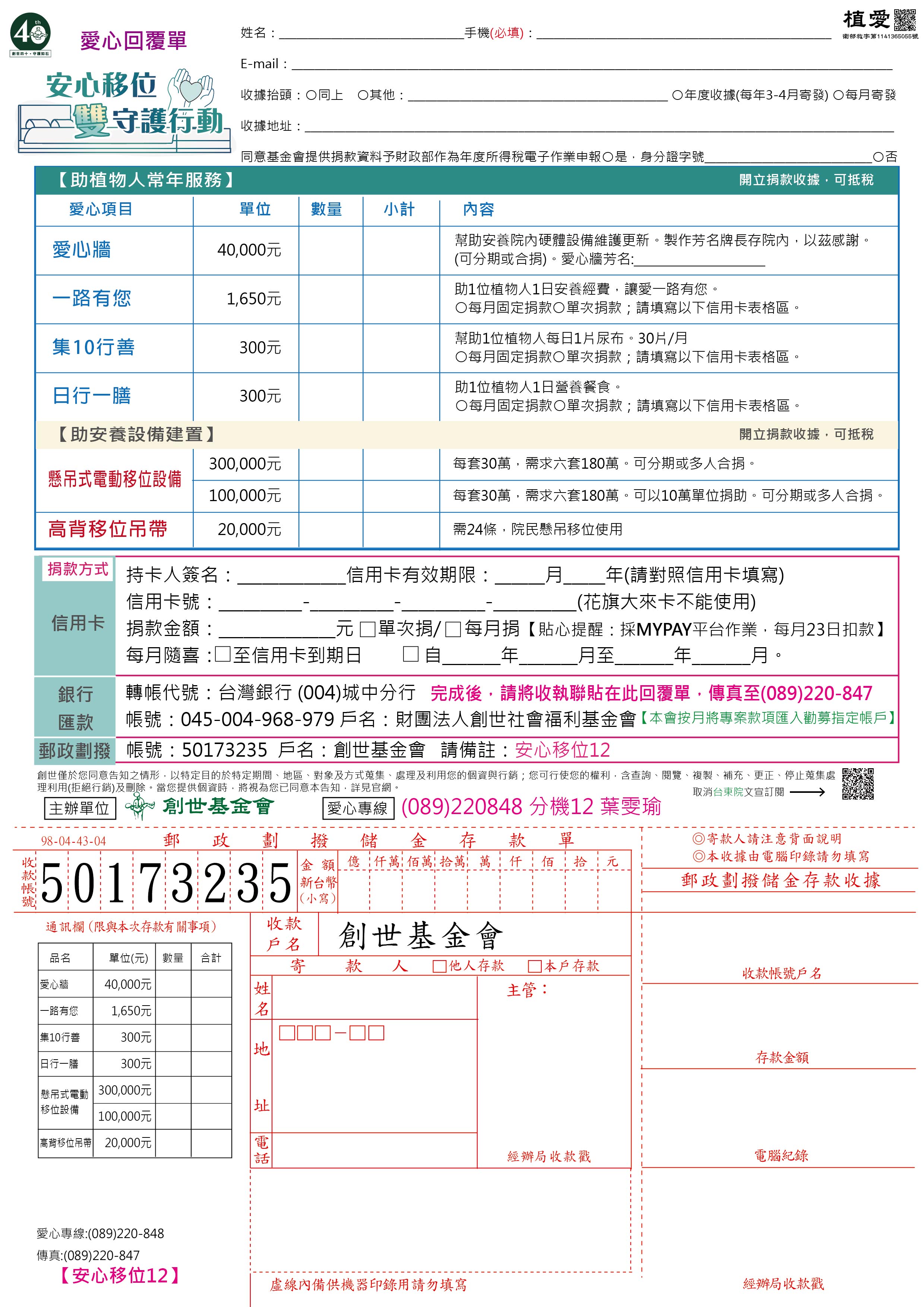 抬頭請開『財團法人創世社會福利基金會』,連同愛心回覆單掛號寄回【安心移位】收。〔本會按月將專案款項匯入勸募指定帳戶〕