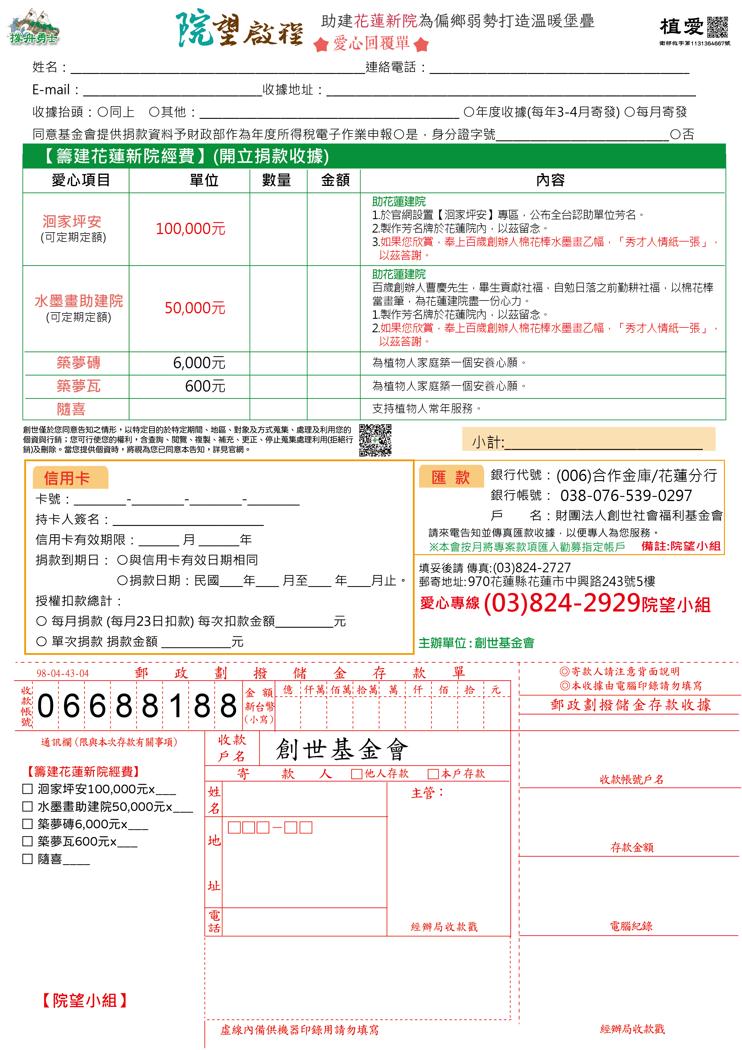 抬頭請開『財團法人創世社會福利基金會』,連同愛心回覆單掛號寄回院望小組收。