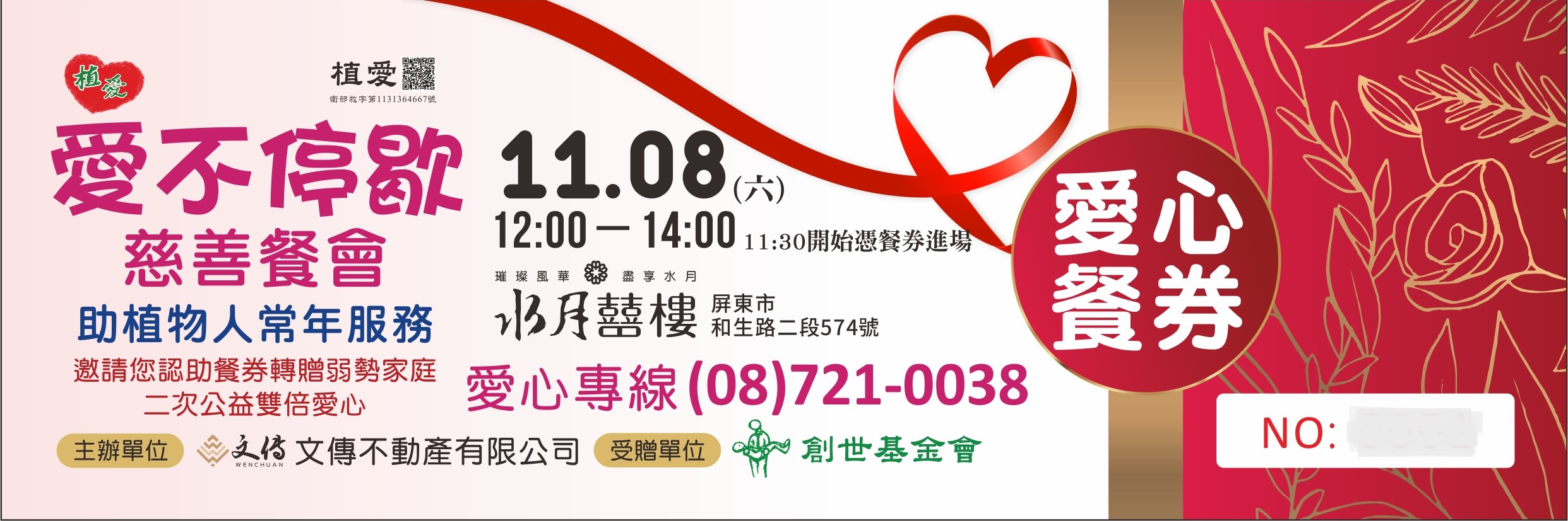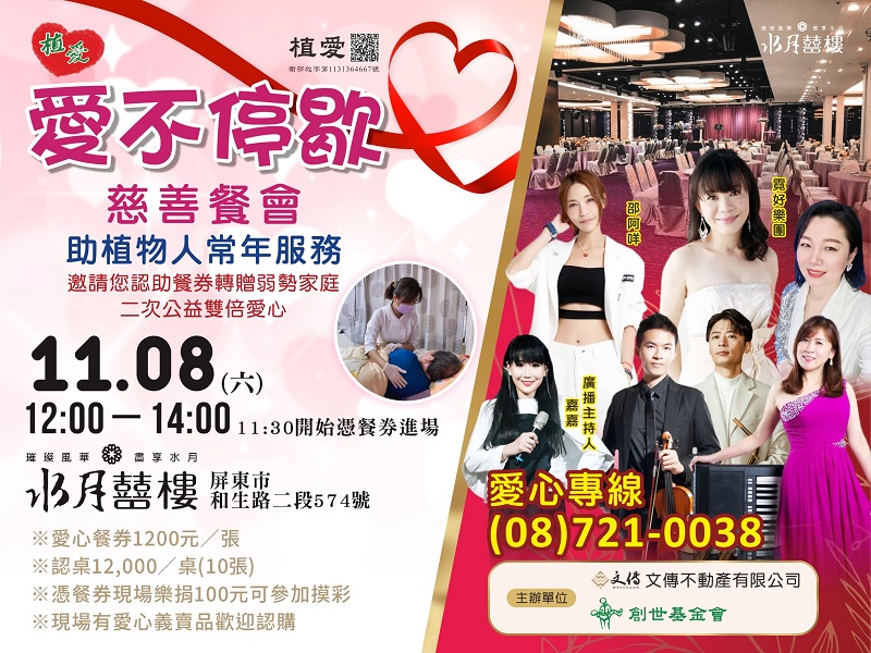 4.認助愛心餐券:$1,200/張,自用或轉贈植物人家屬、弱勢家庭到現場用餐