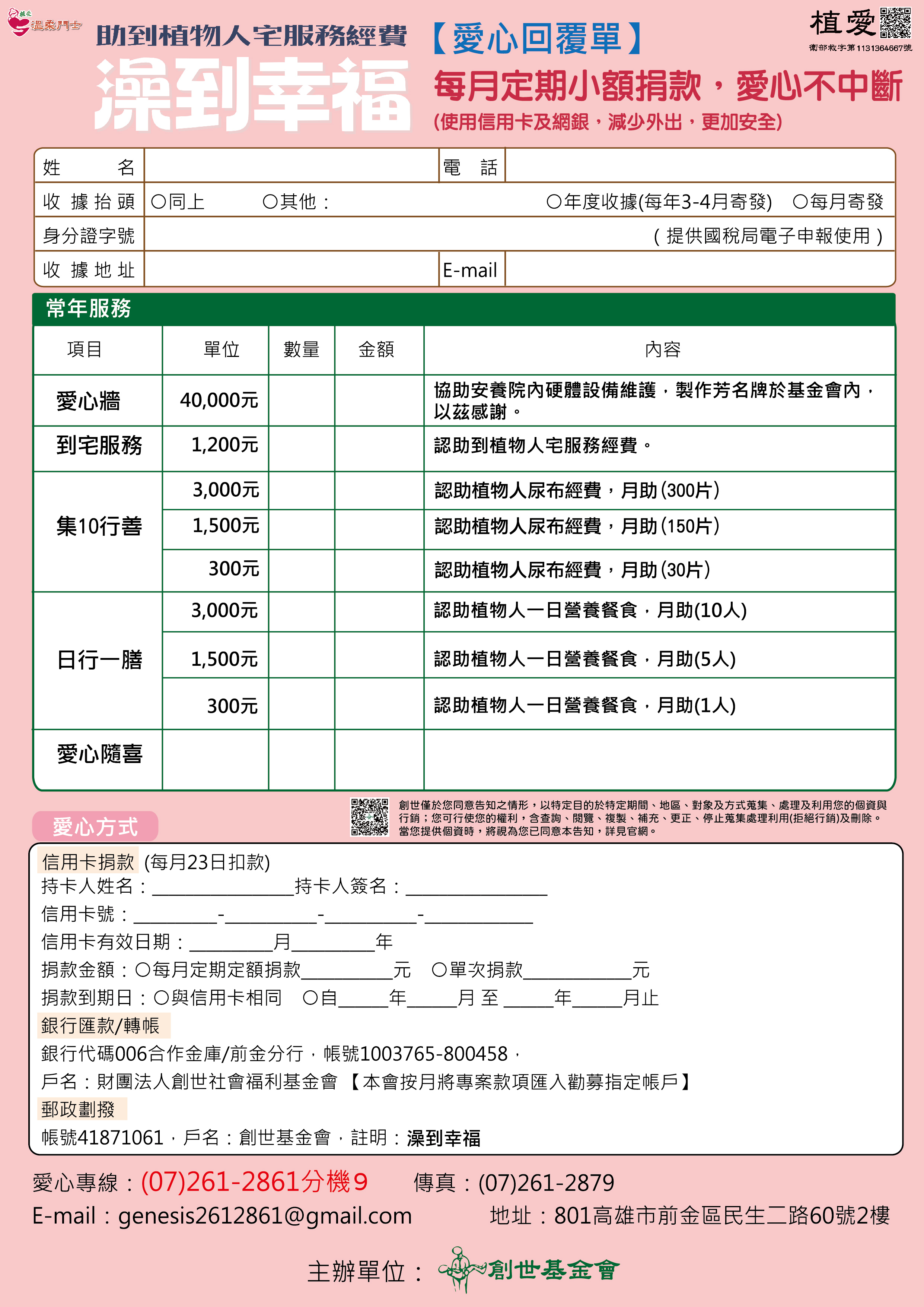 抬頭請開『財團法人創世社會福利基金會』,連同愛心回覆單掛號寄回幸福小組收。