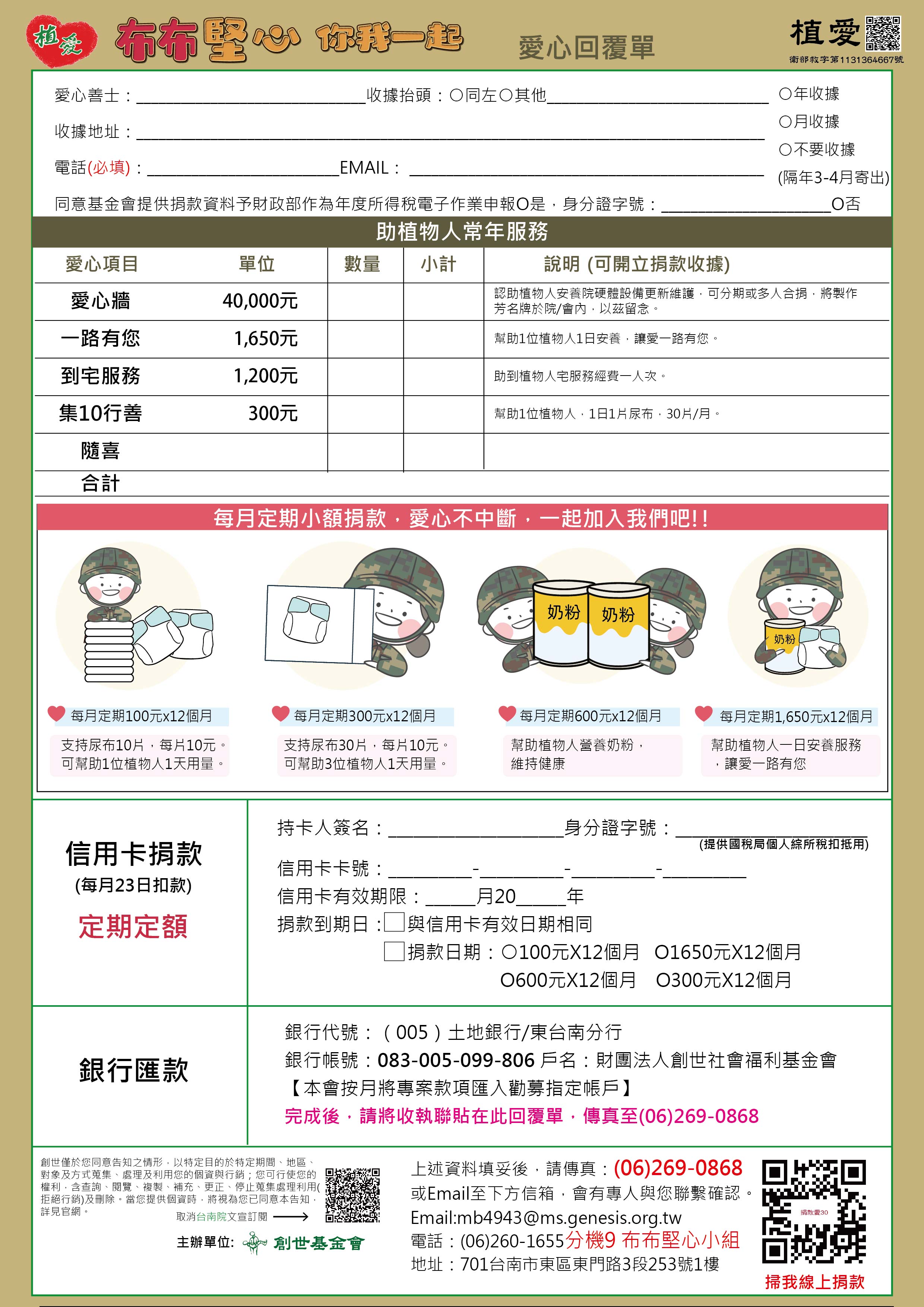 ※轉帳完成後,請來電告知帳號末五碼、收據抬頭、地址,或將存根聯、收據抬頭、電話、地址傳真至(06)269-0868,註明【布布堅心小組9】,以利開立收據。
