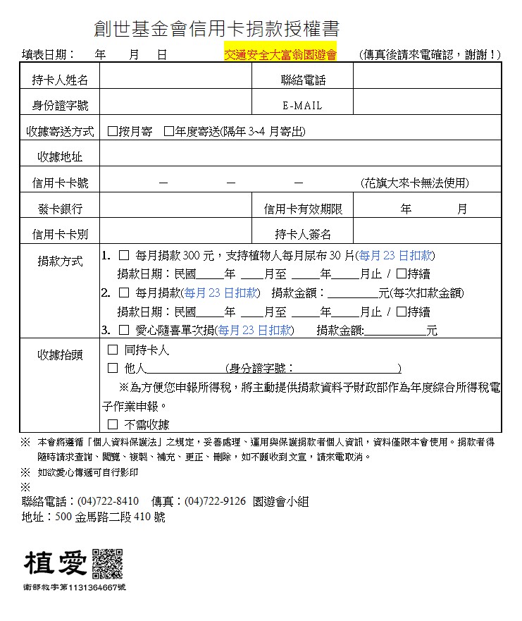 抬頭請開『財團法人創世社會福利基金會』,連同愛心回覆單掛號寄回【園遊會小組】收。