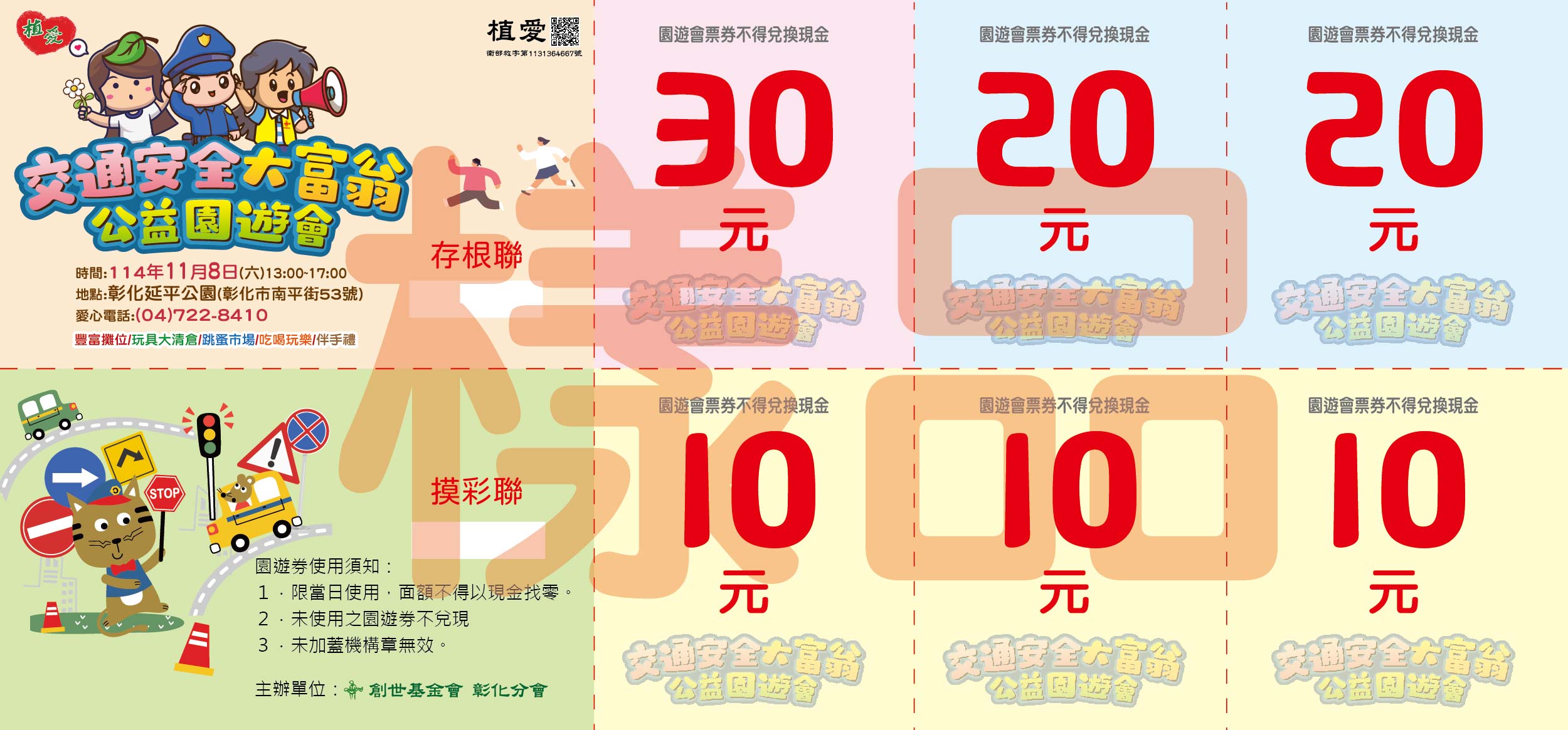 1.認助園遊券:100元/張,限114年11月8日園遊會當天使用,含摸彩券1張,可自用或二次公益轉贈弱勢家庭。