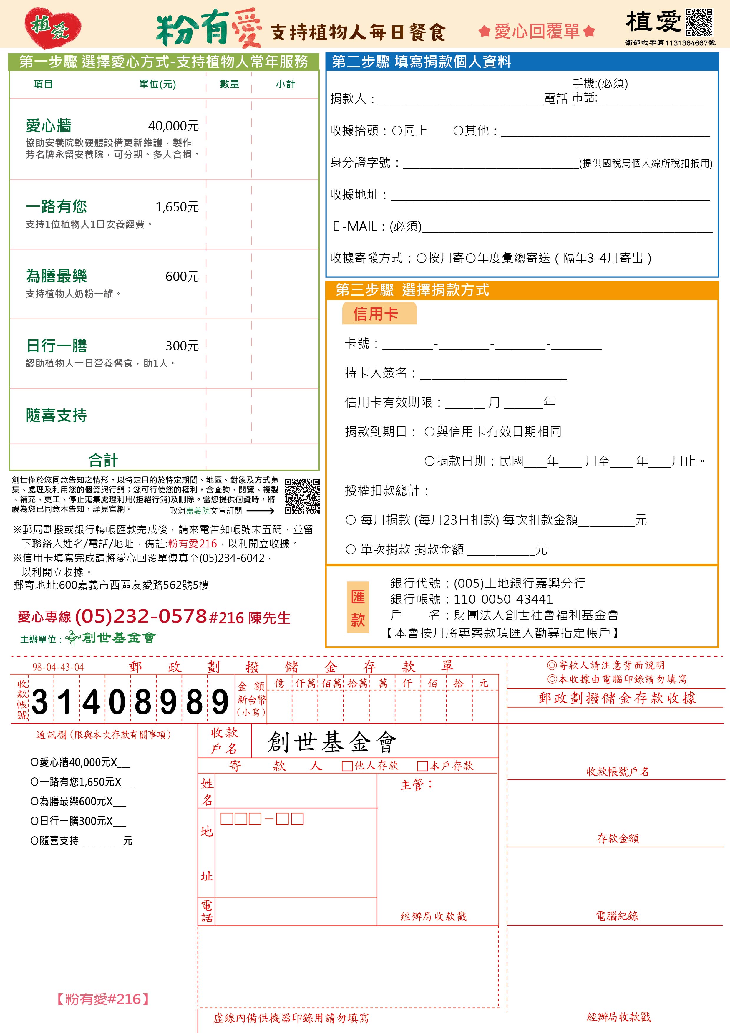 抬頭請開『財團法人創世社會福利基金會』,連同愛心回覆單掛號寄回有愛小組收。