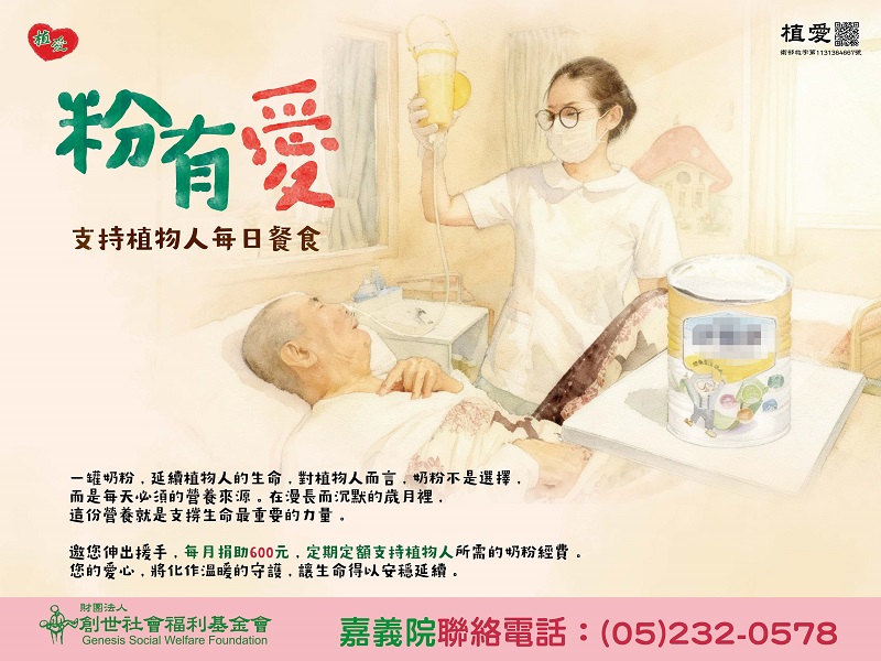 邀您伸出援手,每月捐助600元,定期定額支持植物人所需的奶粉經費。