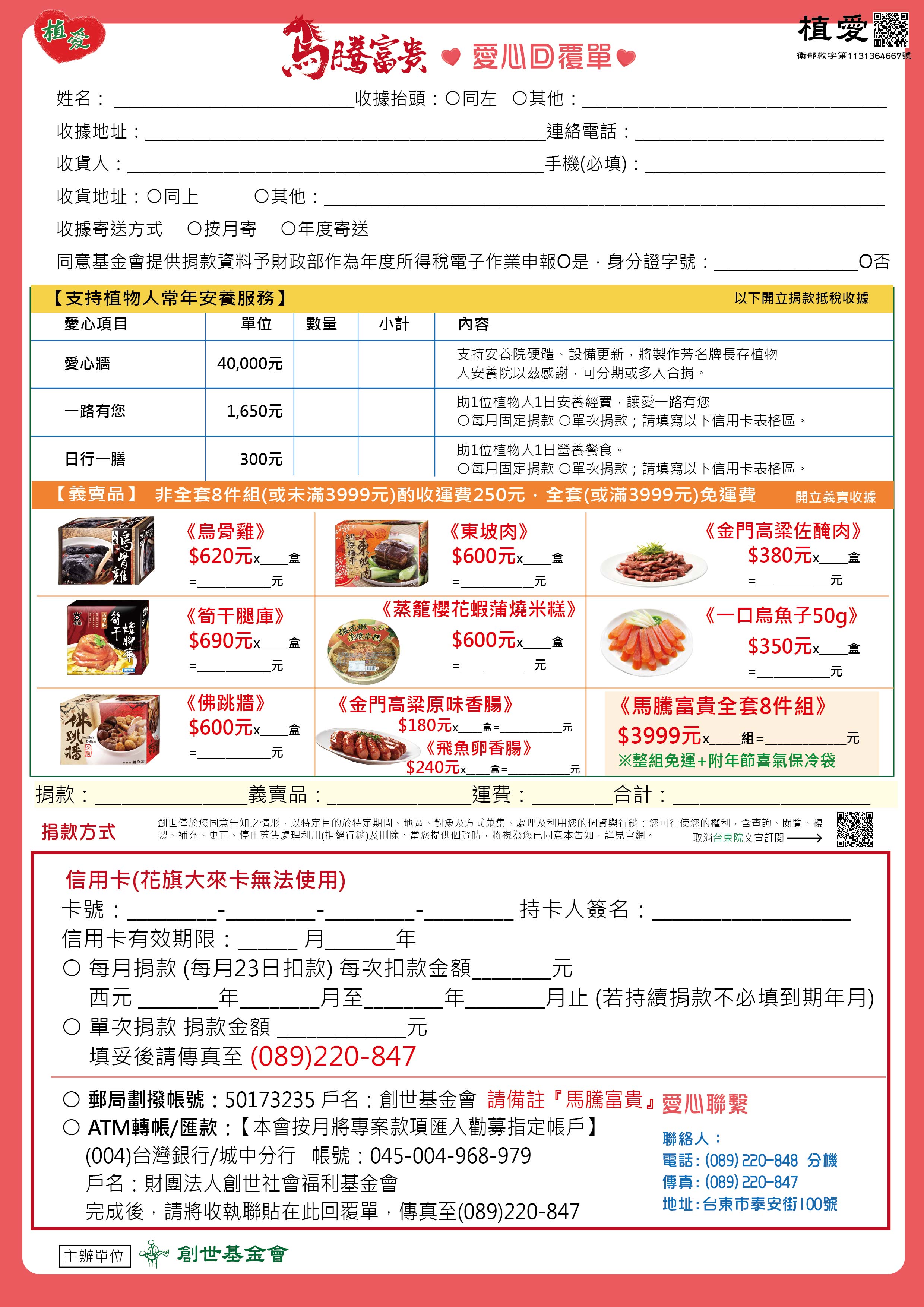 抬頭請開『財團法人創世社會福利基金會』,連同愛心回覆單掛號寄回【年菜小組】收。〔本會按月將專案款項匯入勸募指定帳戶〕