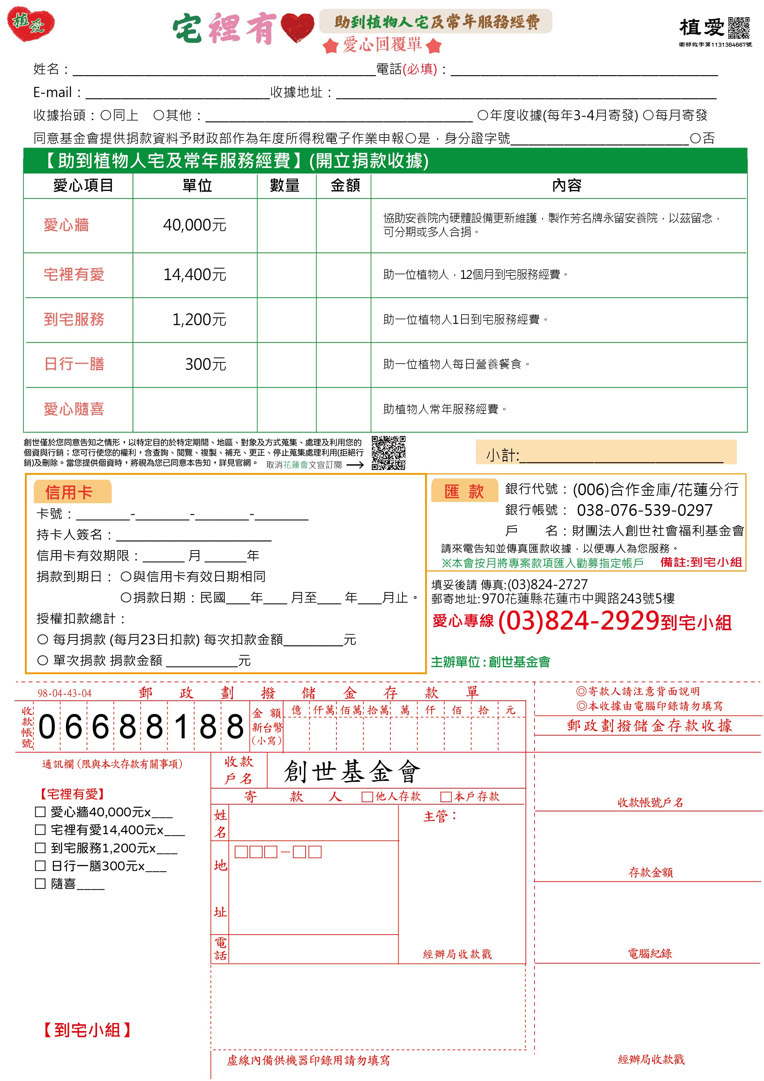 抬頭請開『財團法人創世社會福利基金會』,連同愛心回覆單掛號寄回【到宅小組】收。