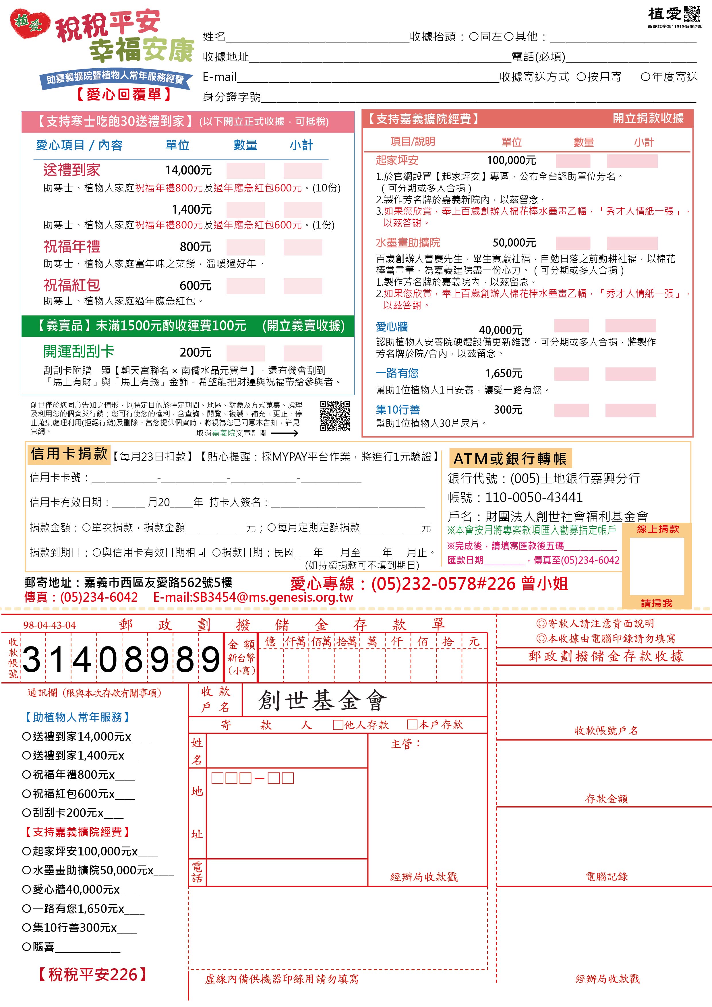 戶名:創世基金會 (請於通訊欄註明【稅稅平安】)