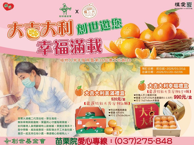 創世基金會長年陪伴這些陷入困境的家庭,守護他們最深的牽掛。在苗栗分院,目前安養著 64位植物人,由專業護理團隊 24小時輪班照護,讓無法親自照顧的家屬,能安心過每一天。今年我們以甜美的茂谷果香,傳遞新年的溫度。每預訂一盒「茂谷禮盒」,不僅是送給親友的祝福,更是一份對植物人家庭的支持。讓這份年節的甜,化為他們溫暖守護的力量。