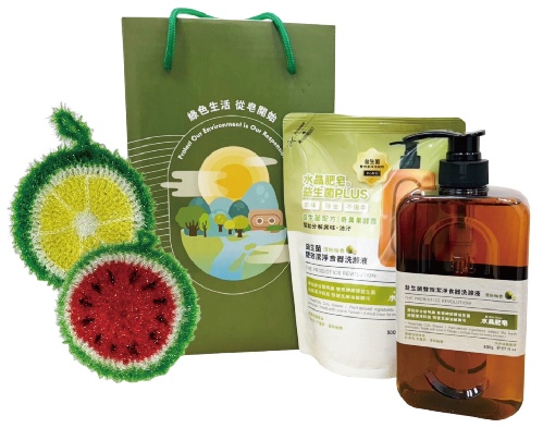 內含益生菌雙效潔淨食器洗滌液、補充包,搭配義工手作精緻菜瓜布(款式隨機出貨)