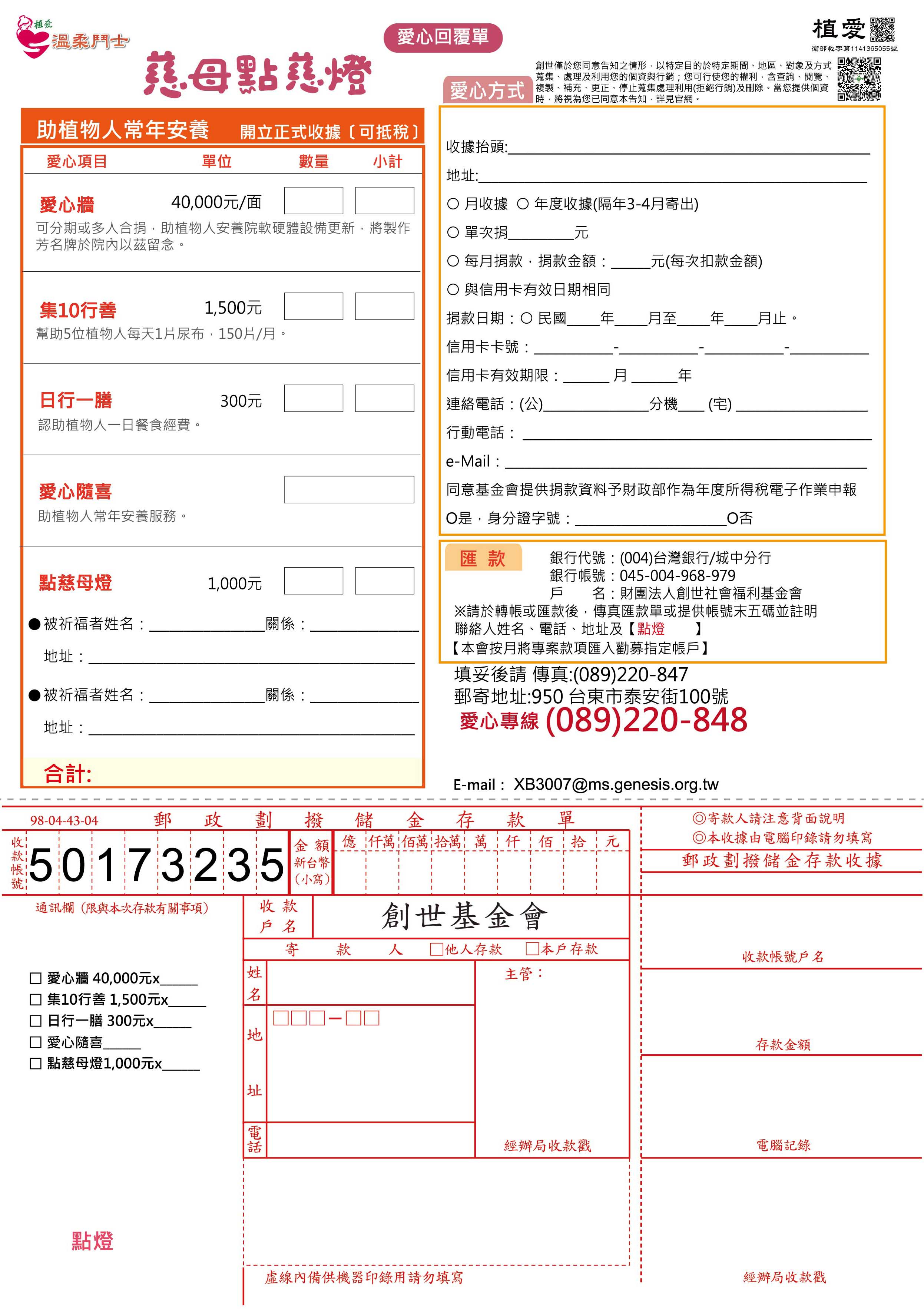 > 帳號:50173235 戶名:創世基金會,請於備註欄註明「點燈」。