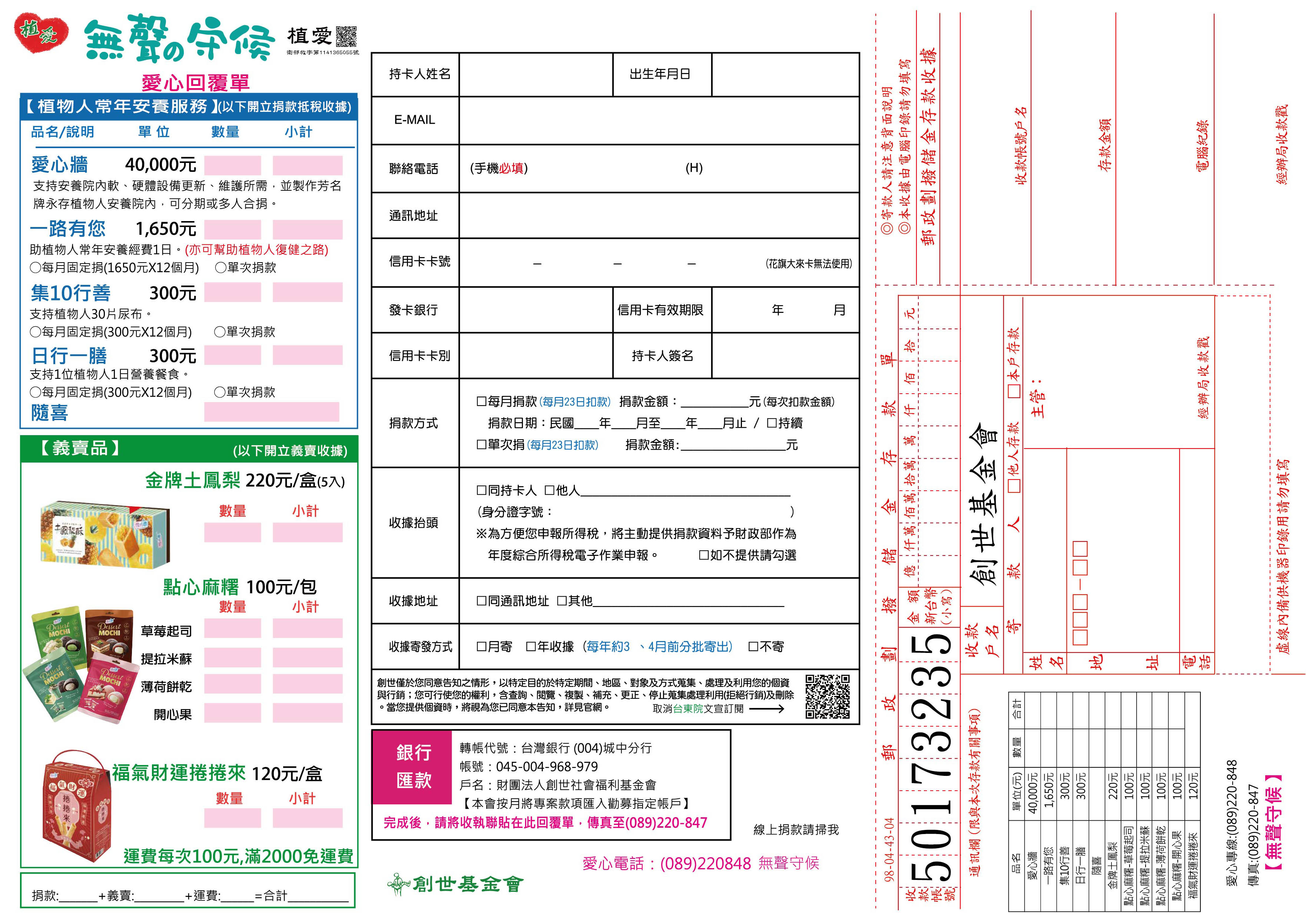 抬頭請開『財團法人創世社會福利基金會』,連同愛心回覆單掛號寄至:台東市泰安街100號,無聲守候小組收。