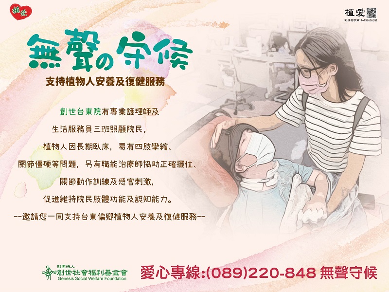 在資源相對匱乏的台東偏鄉,這樣的專業照護得來不易,卻是植物人及其家庭的唯一依靠。誠摯邀請您伸出援手,支持台東偏鄉植物人安養與復健服務經費,讓愛沒有距離,也讓每一位植物人能得到最妥善的照顧。