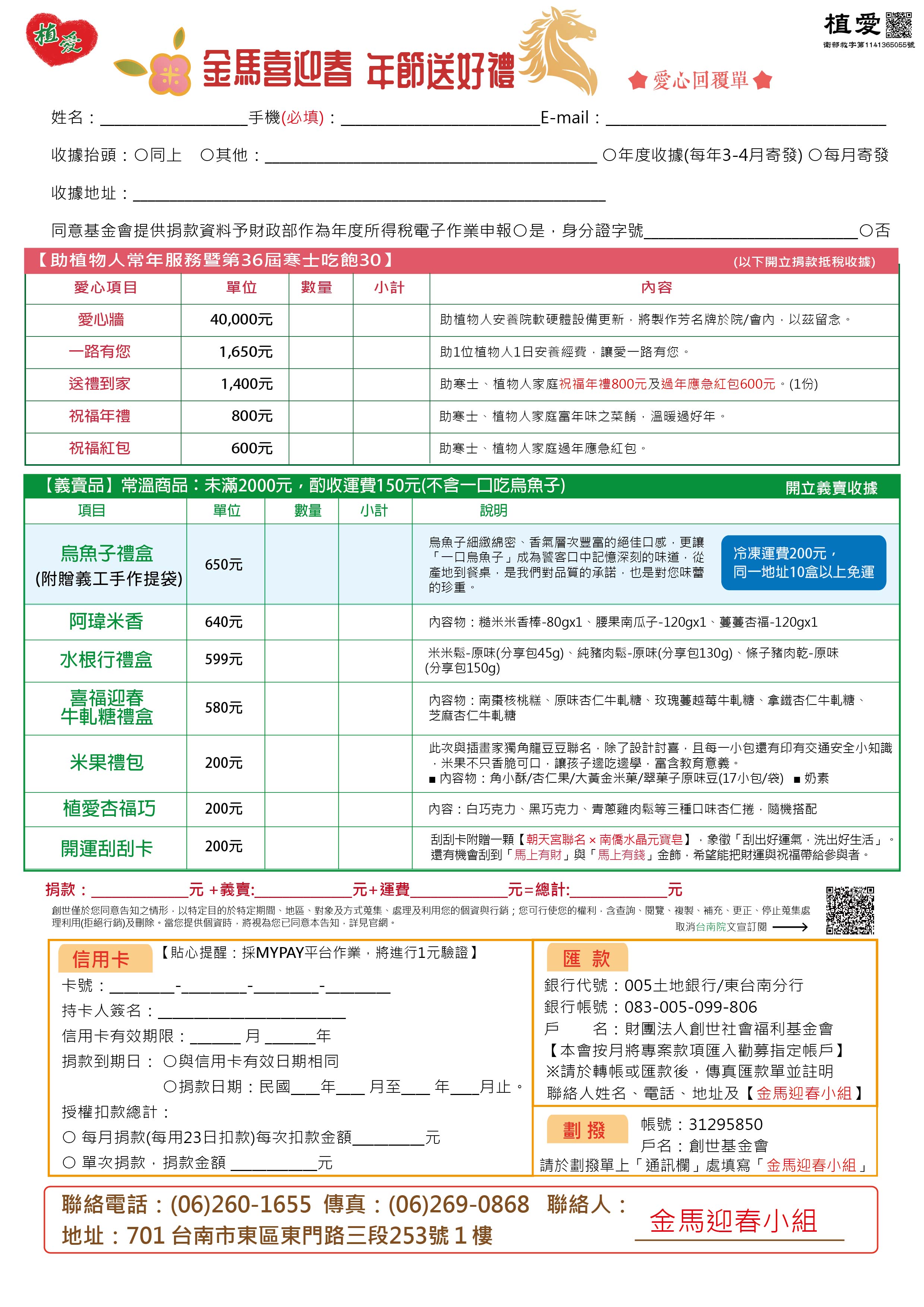 ※轉帳完成後,請來電告知帳號末五碼、收據抬頭、地址,或將存根聯、收據抬頭、電話、地址傳真至(06)269-0868,註明【年節小組】,以利開立收據。