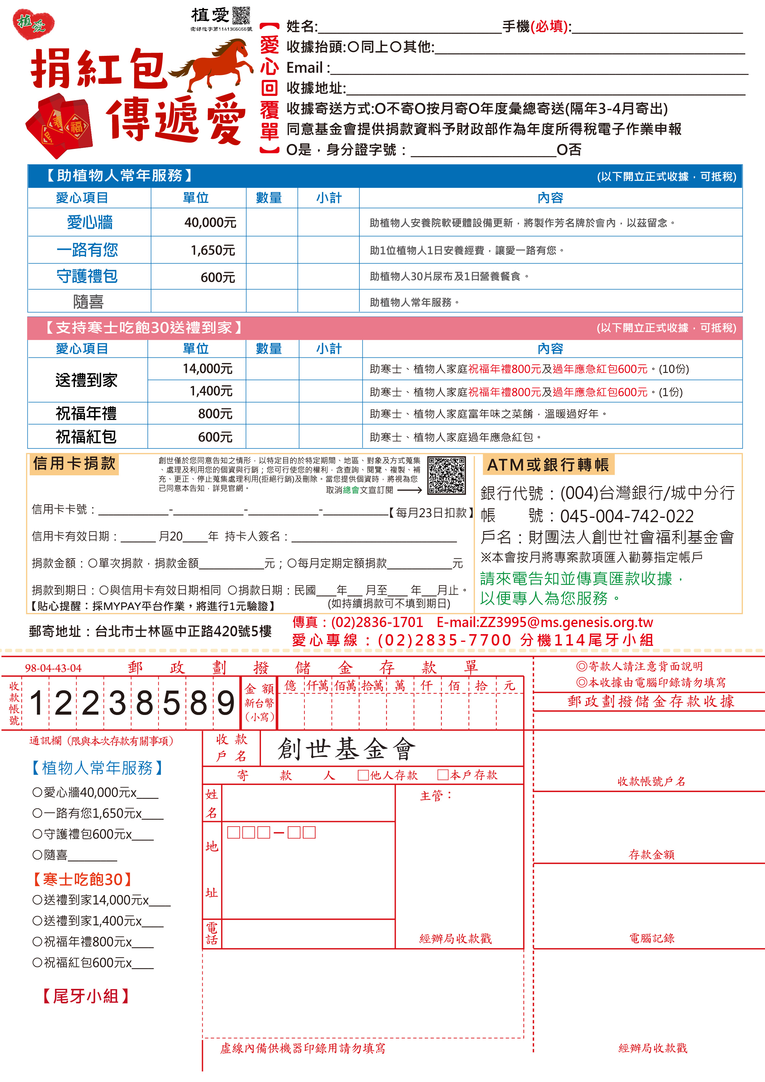 抬頭請開『財團法人創世社會福利基金會』,連同愛心回覆單掛號寄回【紅包小組】收。