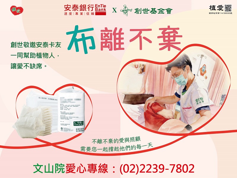 當親人因突發意外或疾病而變成植物人,家庭成員常常需要面對照顧和經濟的雙重挑戰;無止境的經濟壓力與身心負擔,常讓許多家庭感到身心俱疲。在照護植物人的日常裡,為了維持清潔,每兩小時需幫臥床者更換尿布,才能避免濕疹、紅疹或黴菌感染,植物人1日所需的尿布約10~12片,長期花費甚鉅,邀請企業及社會大眾愛心捐助,給他們乾爽舒適的每一天。