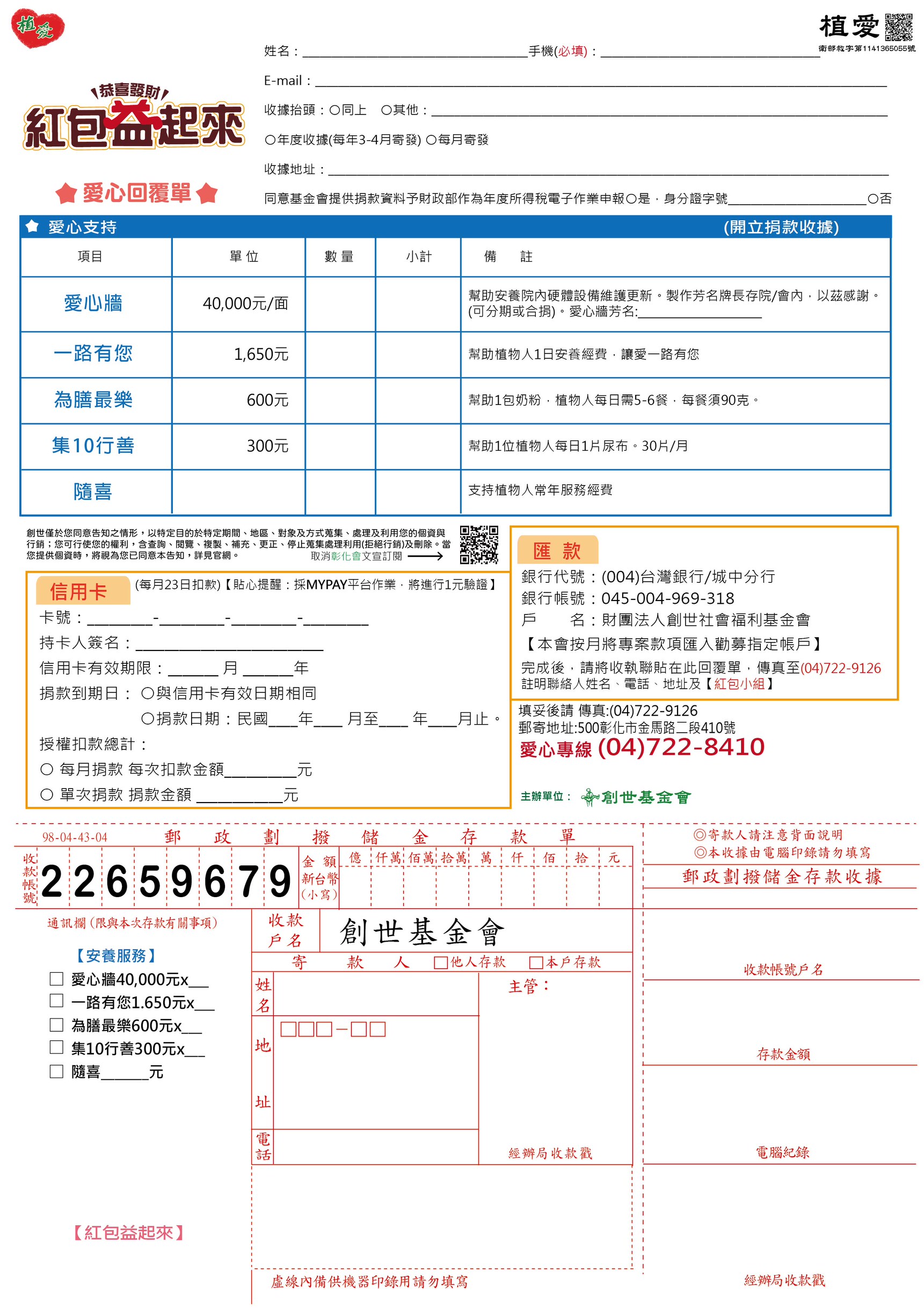 收據抬頭、電話、地址傳真至(04)722-9126,註明【捐紅包】,以利開立收據。
