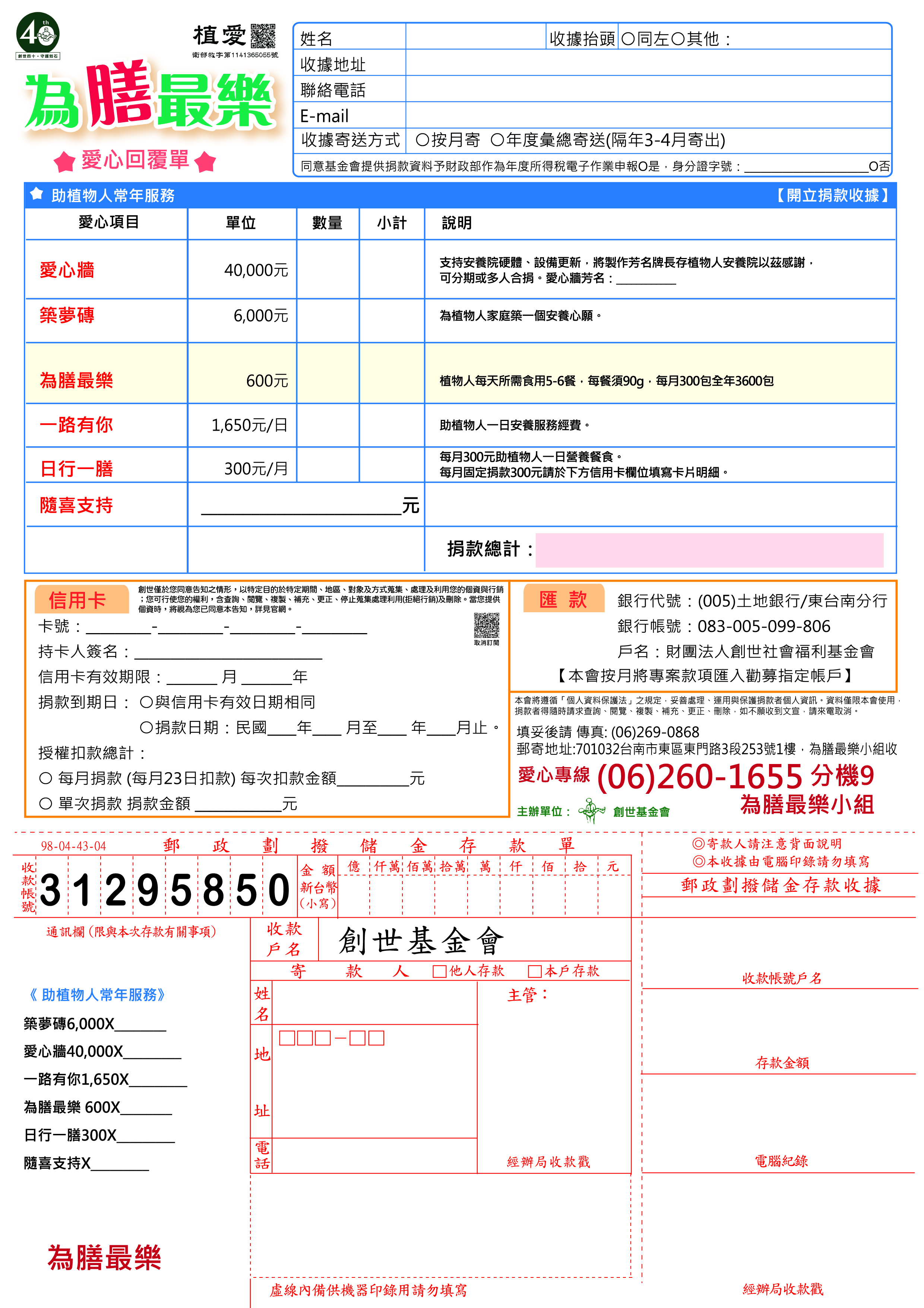 ※轉帳完成後,請來電告知帳號末五碼、收據抬頭、地址,或將存根聯、收據抬頭、電話、地址傳真至(06)269-0868,註明【為膳最樂】,以利開立收據。