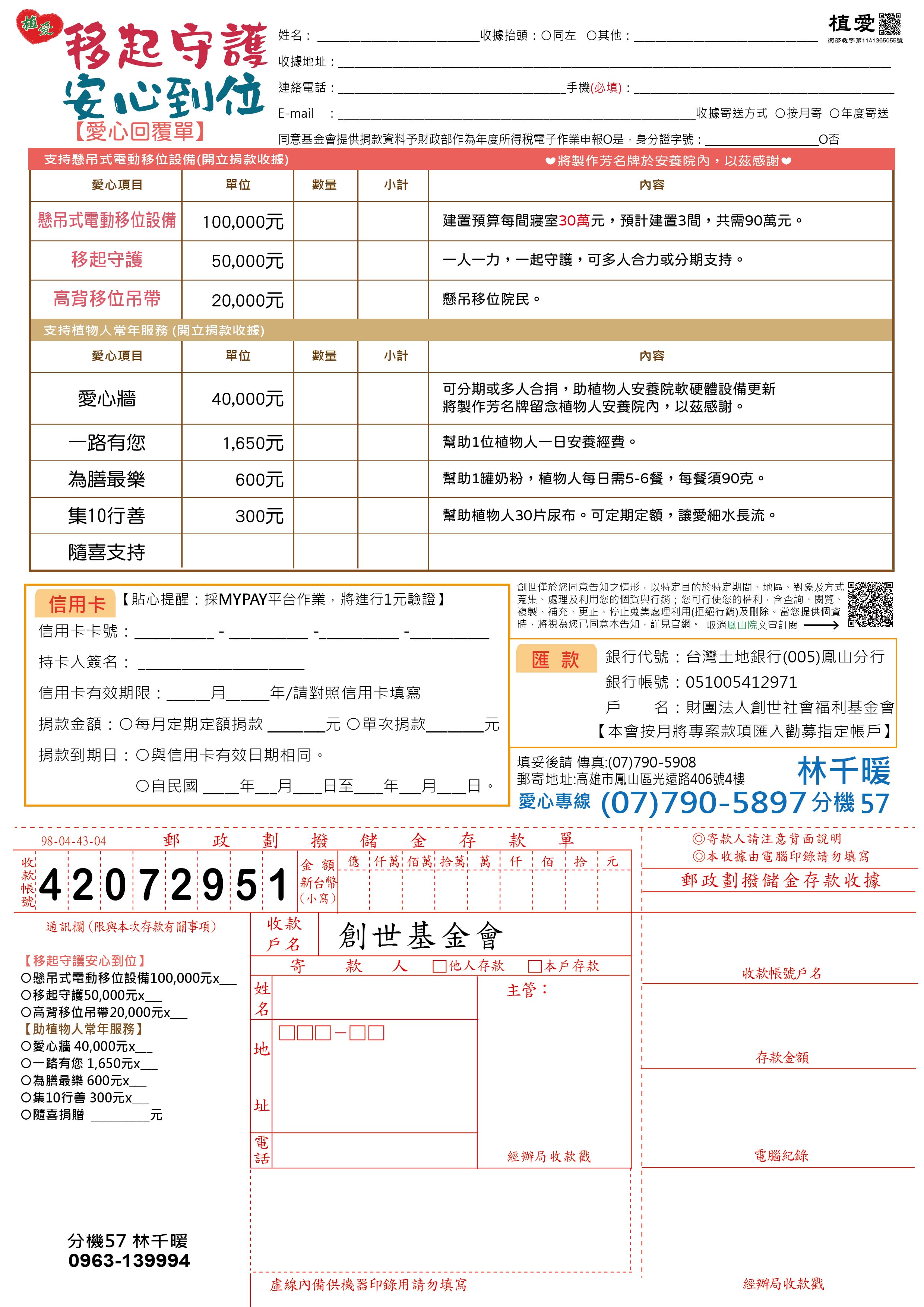抬頭請開『財團法人創世社會福利基金會』,連同愛心回覆單掛號寄回移位小組收。