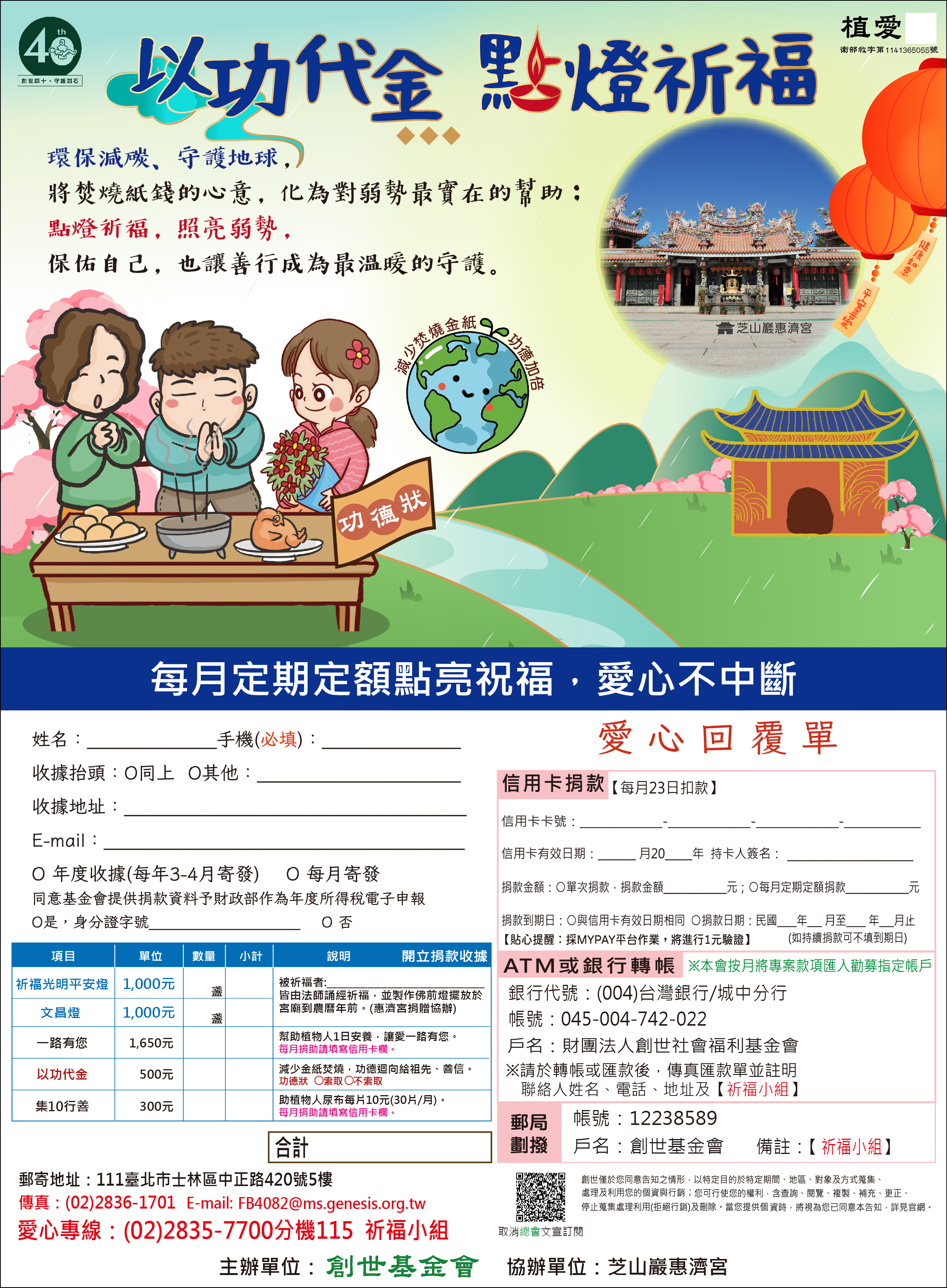 抬頭請開『財團法人創世社會福利基金會』,連同愛心回覆單掛號寄回祈福小組收。