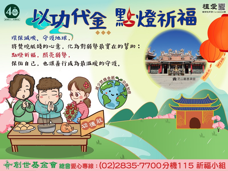 將購買紙錢的預算,轉捐創世基金會,以心誠則靈方式將愛留人間,同時響應環保,功德迴向給先人或現世子民,一舉數得。