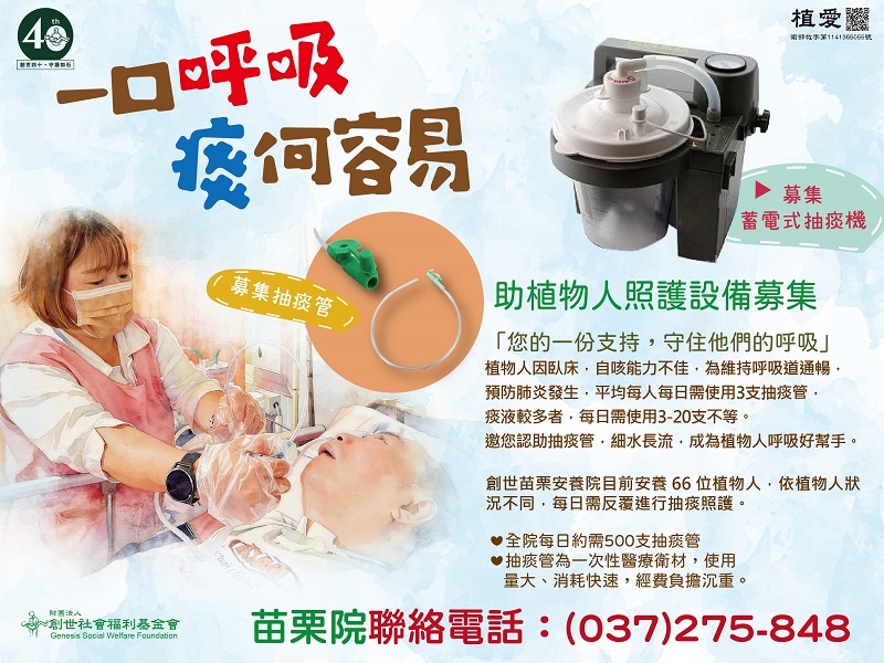 創世苗栗安養院目前安養 66位植物人,依病況不同,每日需反覆進行抽痰照護。
