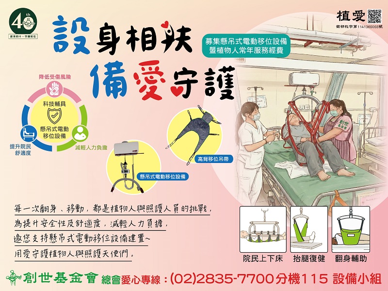 創世基金會長期投入弱勢植物人照護,平均每位住民每日所需照護操作超過 10次以上,包含翻身拍背、擺位、補給、下床活動與復能訓練等。這些高負重、反覆彎腰搬移的動作等長期下來極易導致工作人員身體的損傷,更潛藏院民跌落、骨折等風險,對人力與設備的依賴極高。