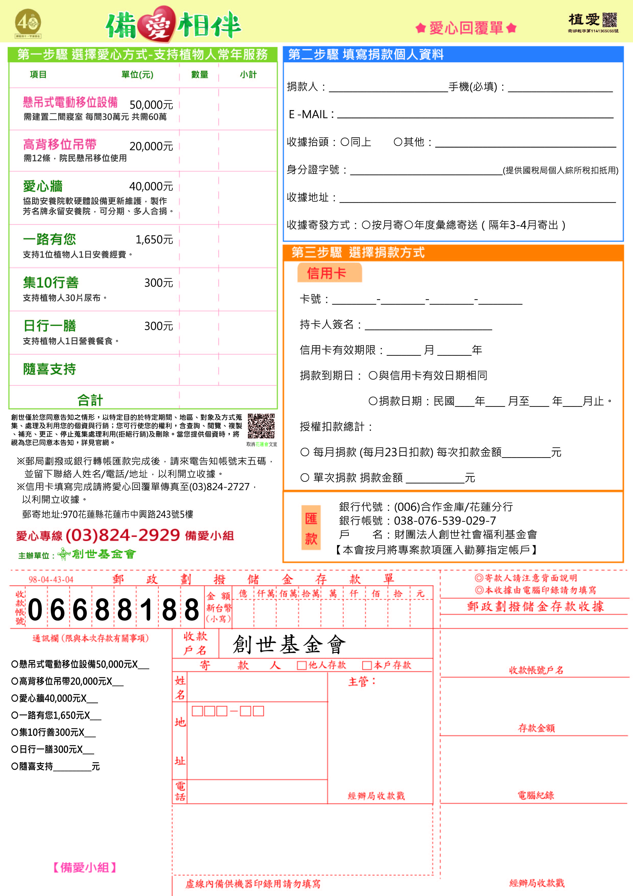 抬頭請開『財團法人創世社會福利基金會』,連同愛心回覆單掛號寄回備愛小組收。