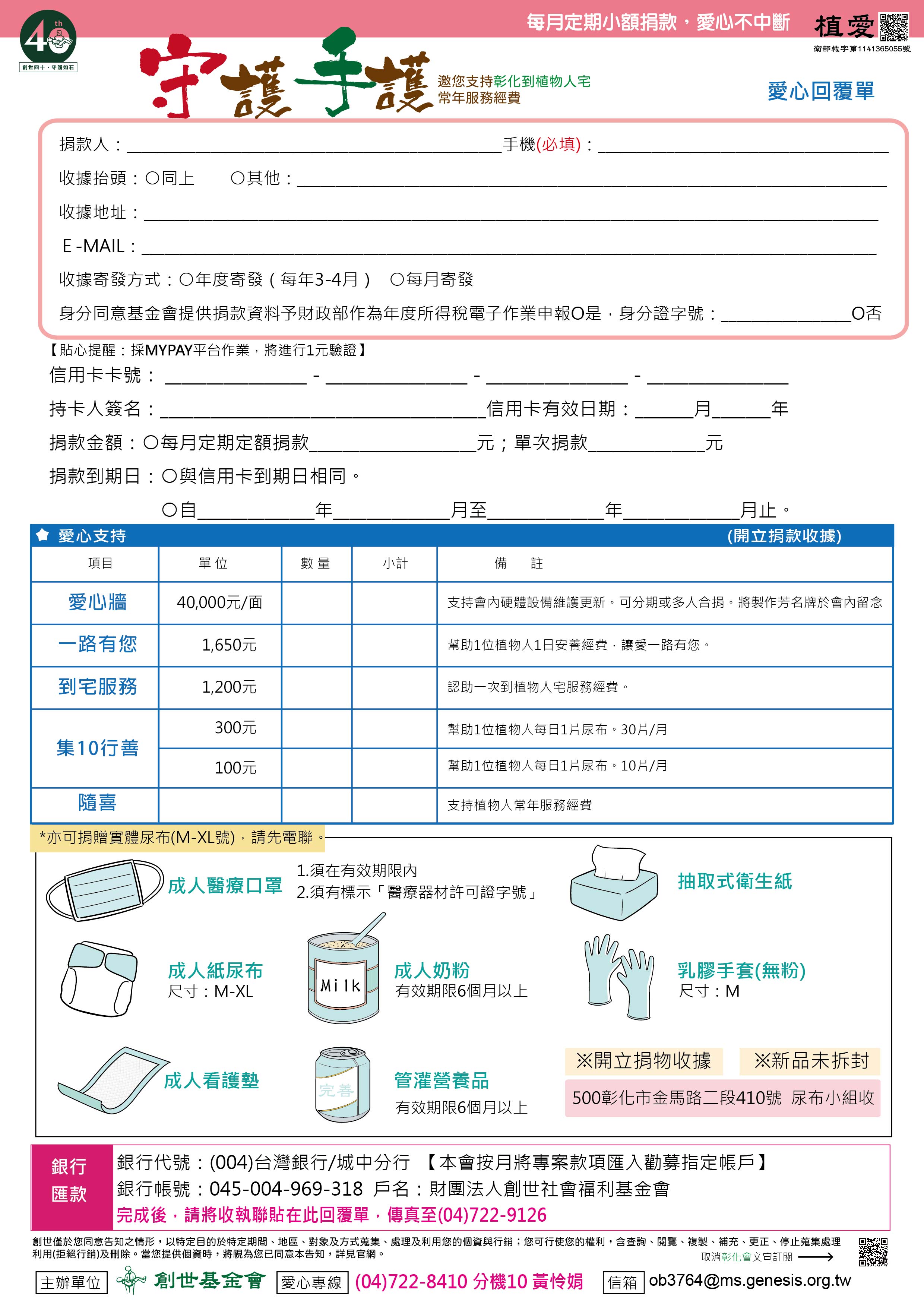 抬頭請開『財團法人創世社會福利基金會』,連同愛心回覆單掛號寄回手護小組收。