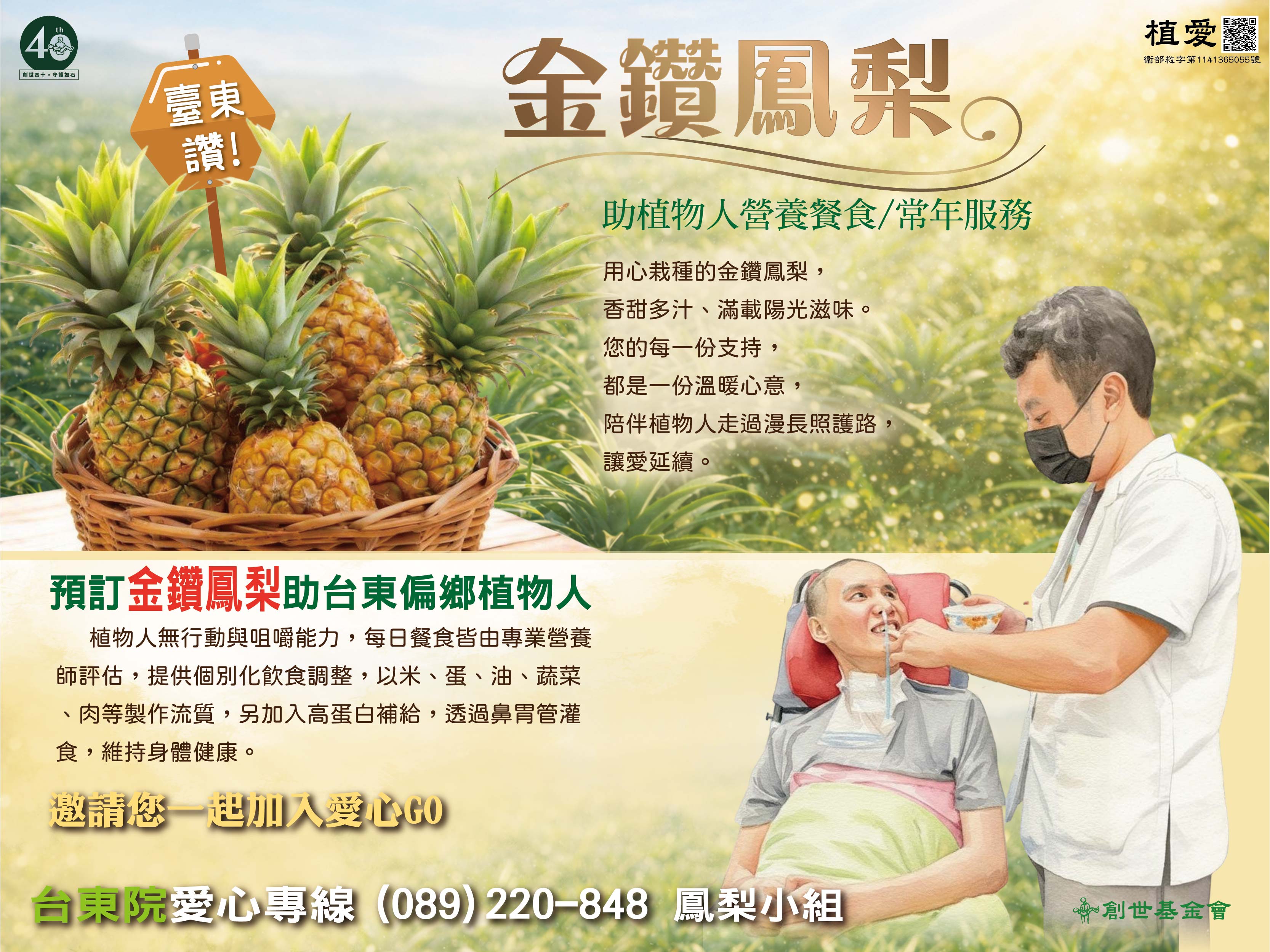臺東讚!無毒金鑽鳳梨,好時果子,堅持「好時節」所產的「好食果」, 讓每位善心人士品嚐並感受到「農夫」辛勤的付出,宛如創世基金會照護植物人的用心,邀您一起幫助植物人安養服務。