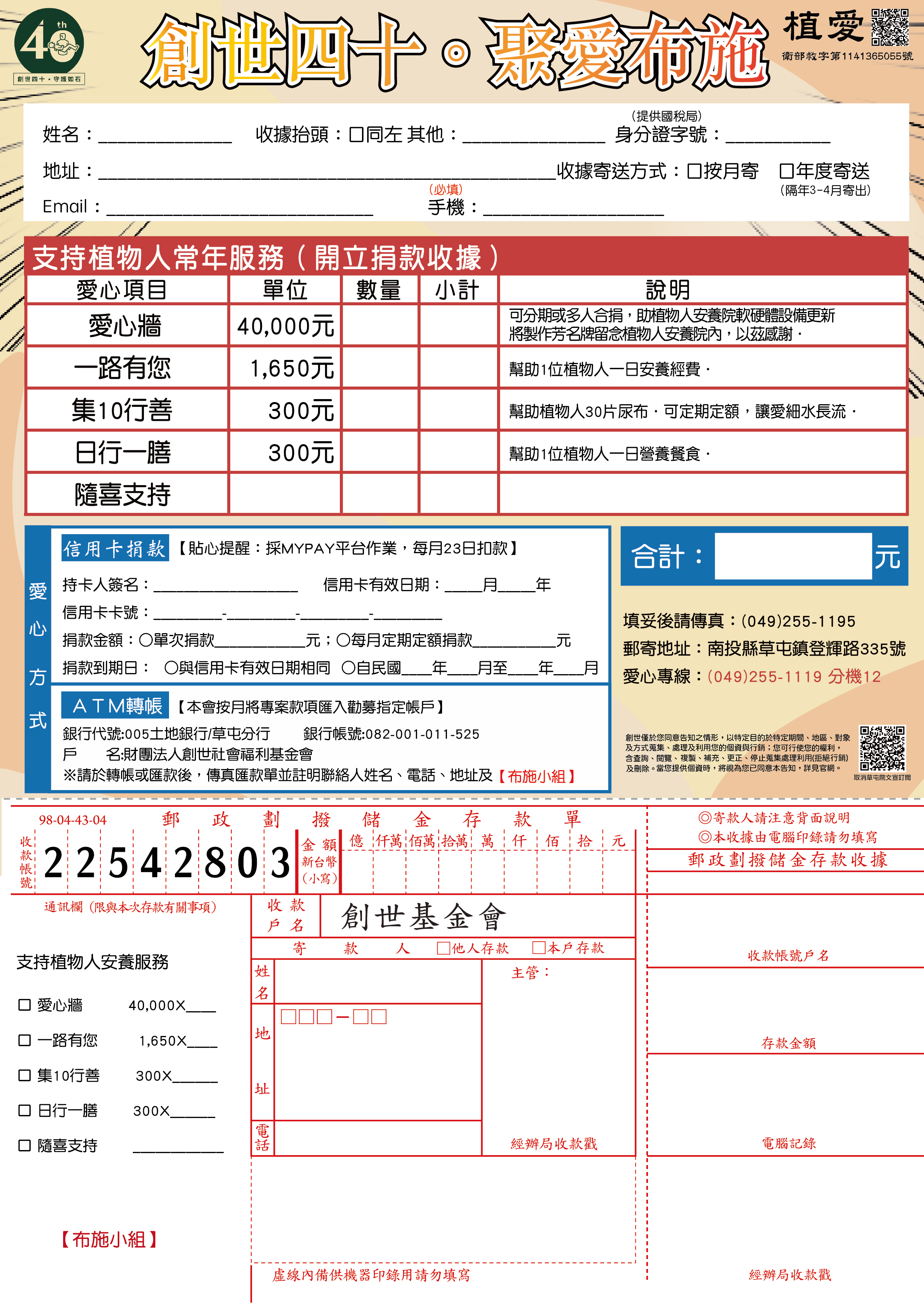 抬頭請開『財團法人創世社會福利基金會』,掛號寄回。