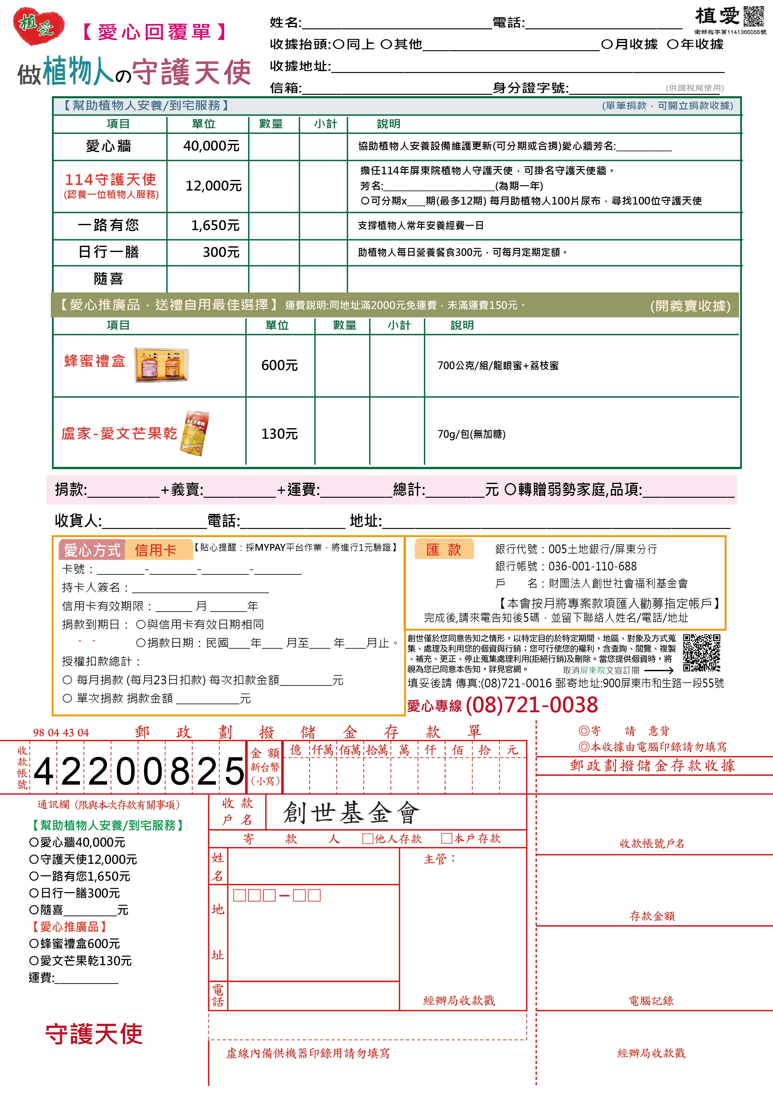 並將收據貼在愛心回覆單上傳真至(08)721-0016