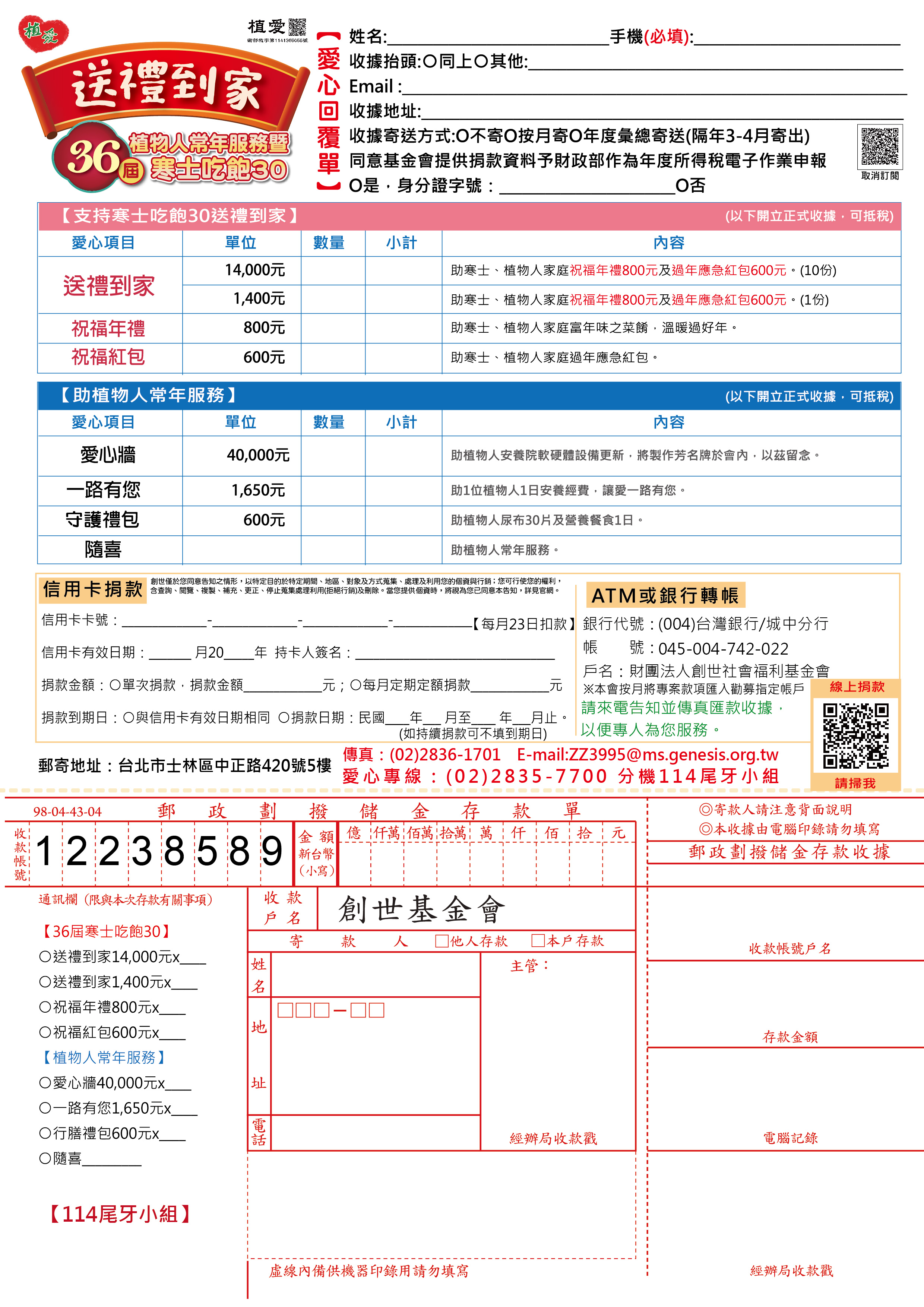 抬頭請開『財團法人創世社會福利基金會』,連同愛心回覆單掛號寄回【尾牙小組】收。