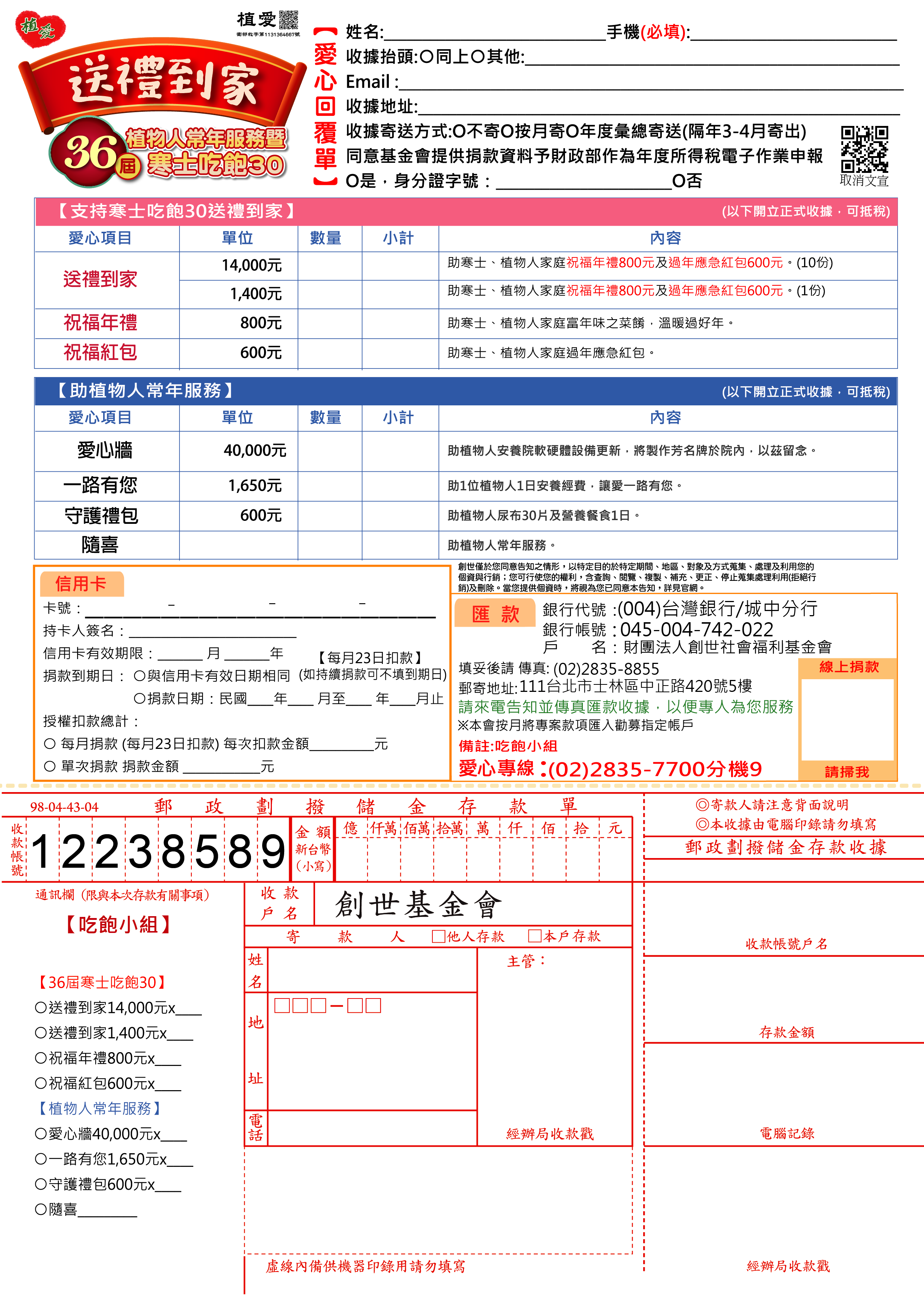 抬頭請開『財團法人創世社會福利基金會』,連同愛心回覆單掛號寄回【吃飽小組】收。