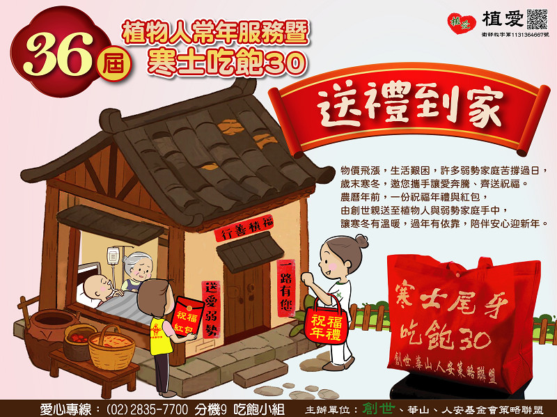 歲末寒冬,邀您攜手讓愛奔騰、齊送祝福。農曆年前,一份祝福年禮與紅包,由創世親送至植物人與弱勢家庭手中,讓寒冬有溫暖、過年有依靠,陪伴他們安心迎新年。