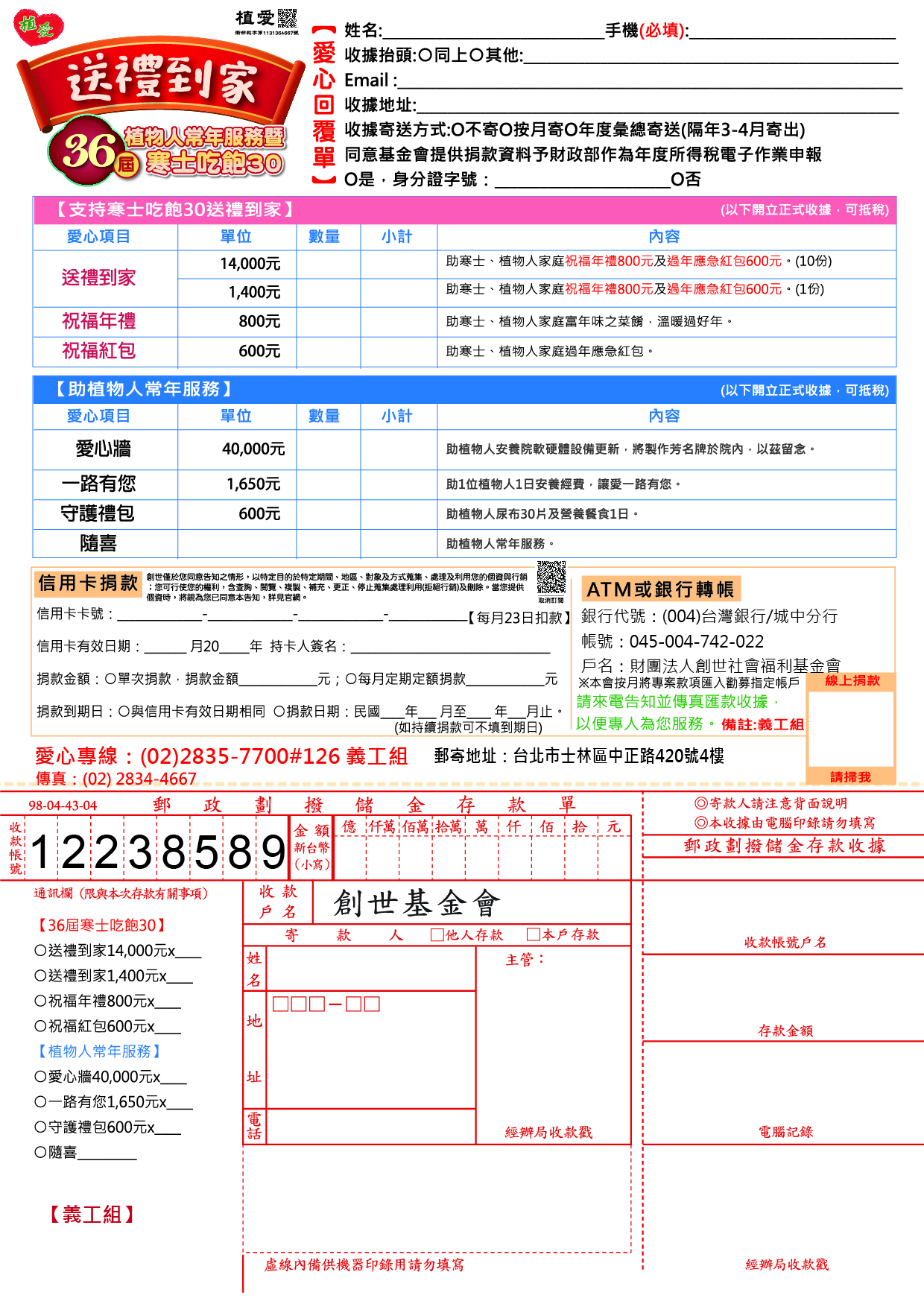 抬頭請開『財團法人創世社會福利基金會』,連同愛心回覆單掛號寄回【義工組】收。