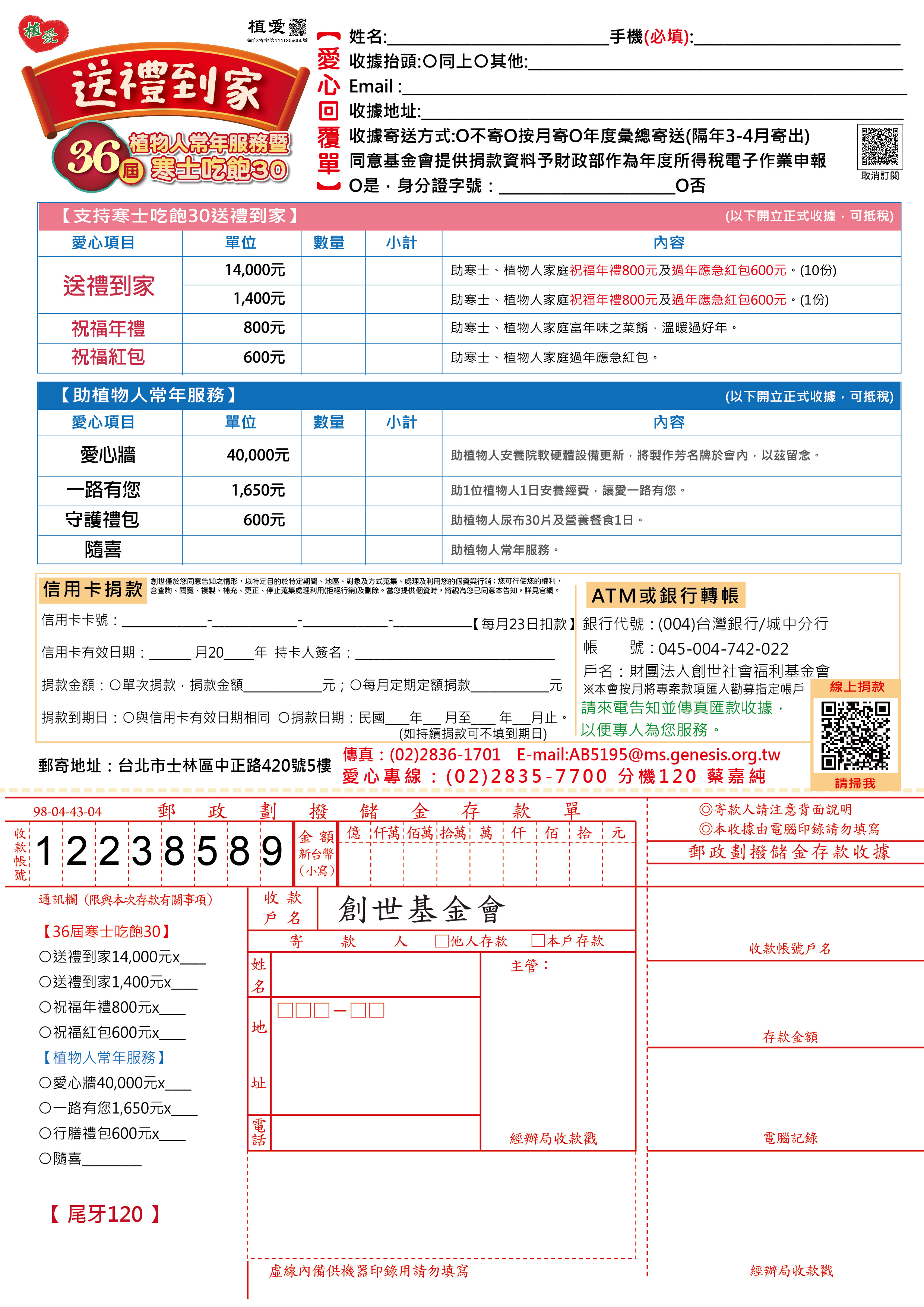 抬頭請開『財團法人創世社會福利基金會』,連同愛心回覆單掛號寄回【樂絲燕120】收。