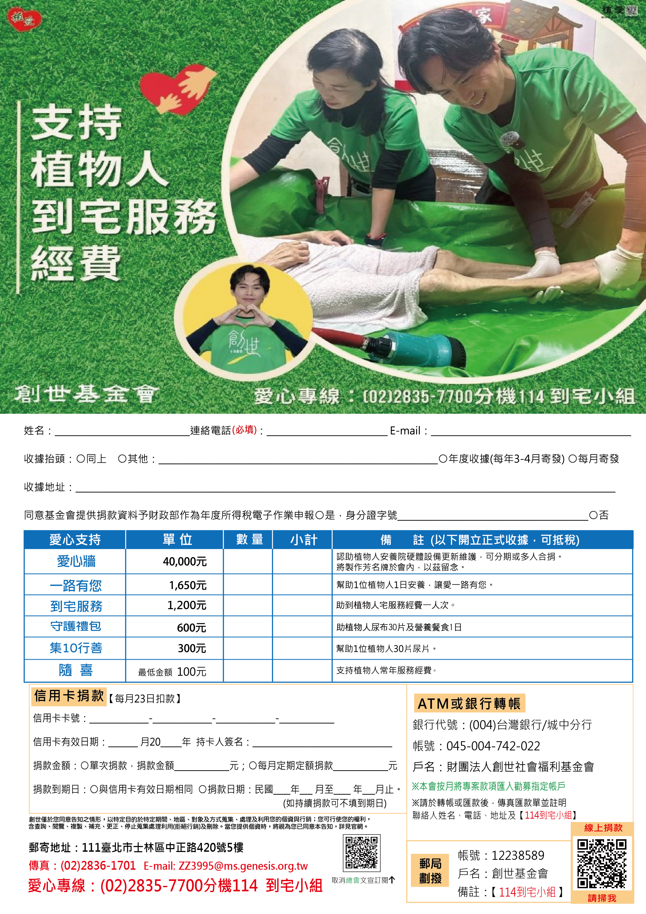 抬頭請開『財團法人創世社會福利基金會』,連同愛心回覆單掛號寄回【到宅小組】收。