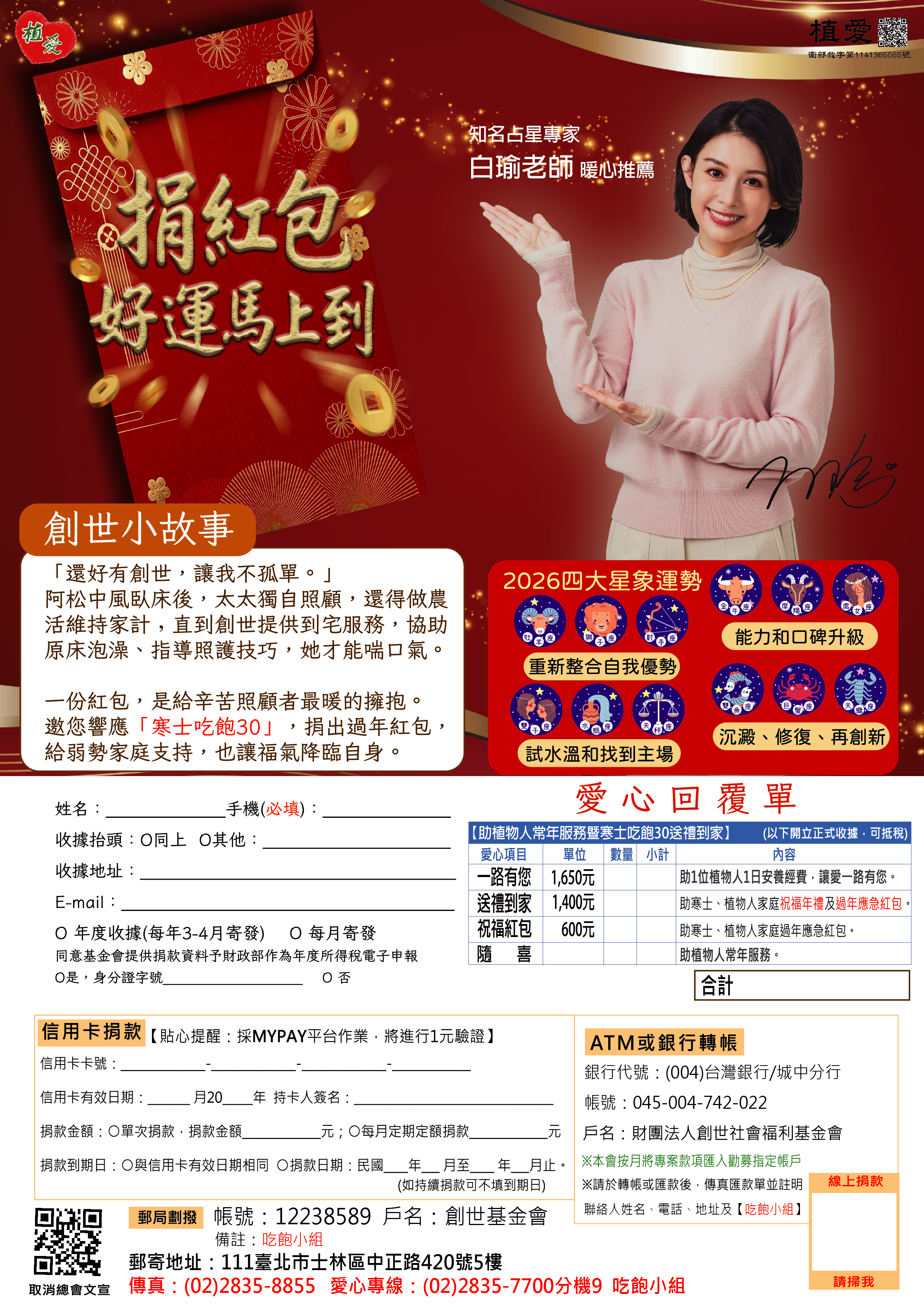 抬頭請開『財團法人創世社會福利基金會』,連同愛心回覆單掛號寄回【吃飽小組】收。