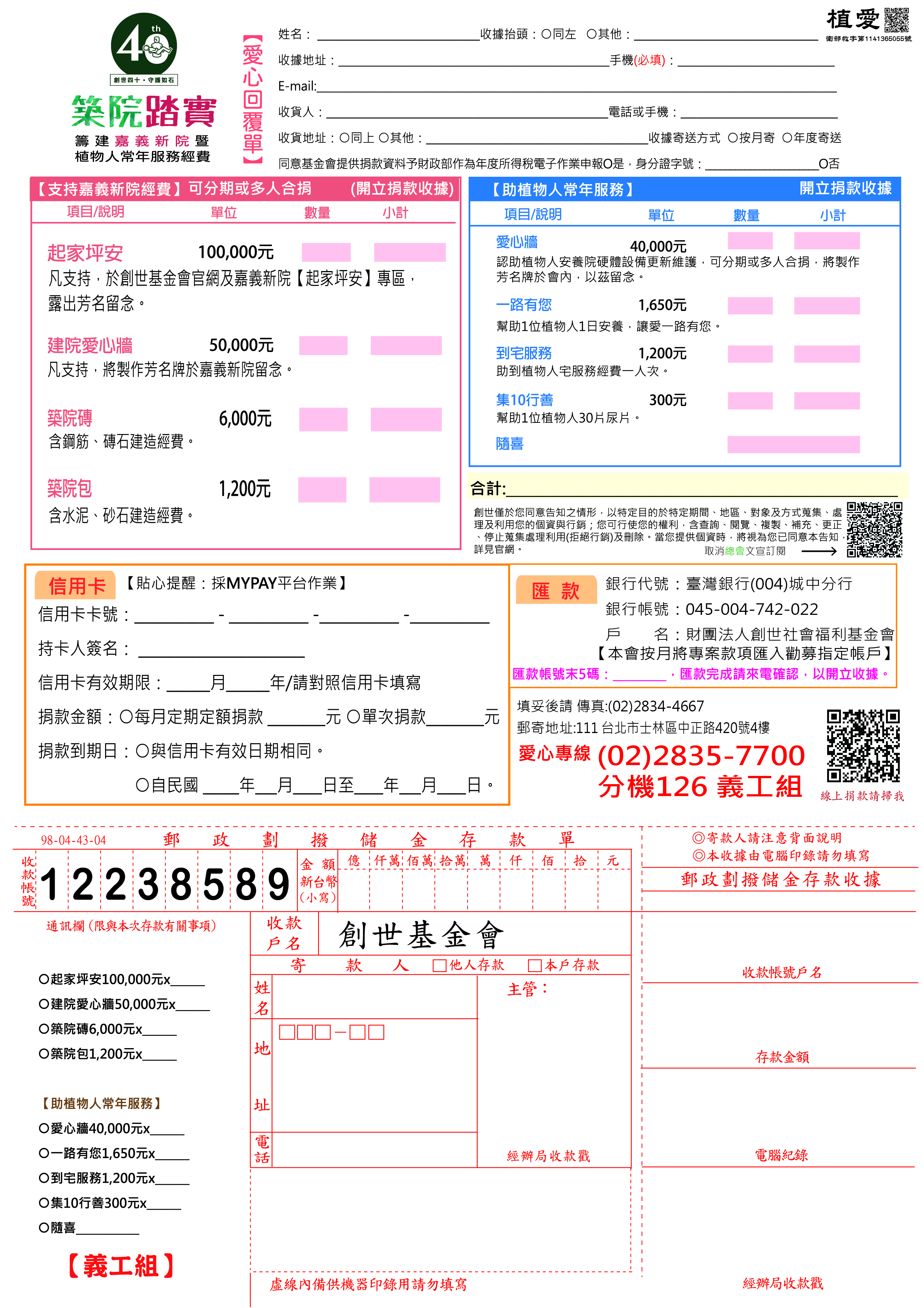 抬頭請開『財團法人創世社會福利基金會』,連同愛心回覆單掛號寄回義工組收。