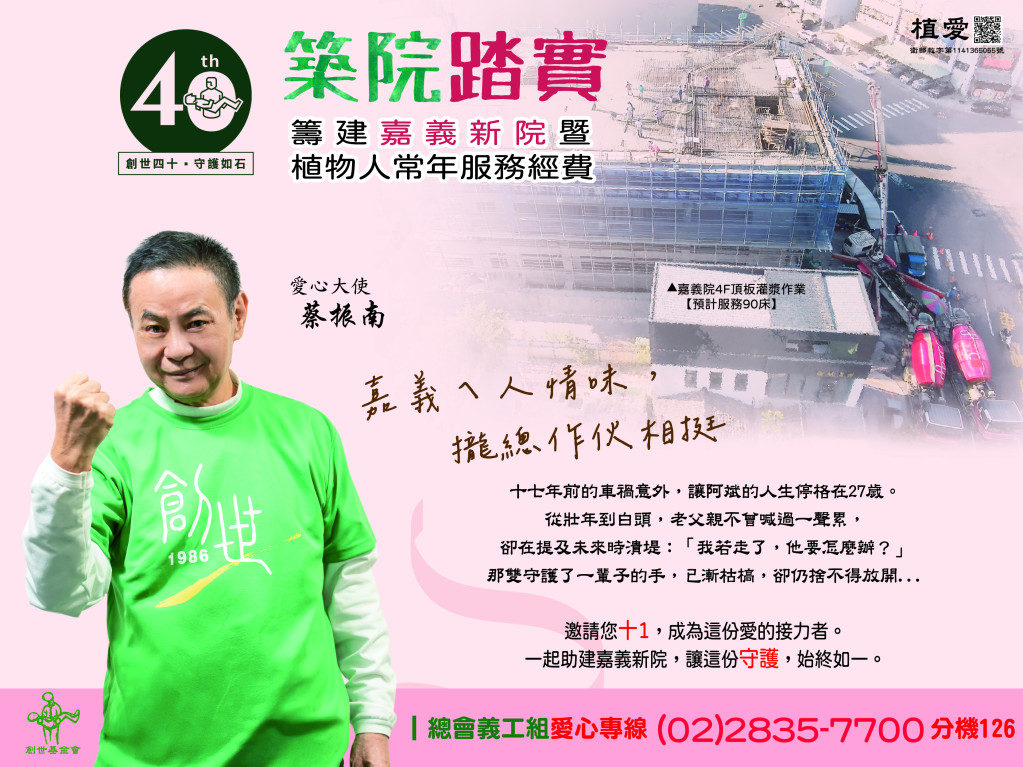 然而,在許多我們看不見的社會角落,仍有無數弱勢家庭正苦苦等待援助。嘉義院目前已滿床,卻仍有許多個案急需入住。為了不讓家庭在無助中崩潰,我們誠摯邀請您一起助建植物人的堡壘──嘉義新院,為等待中的生命撐起一個可以安心託付的家。